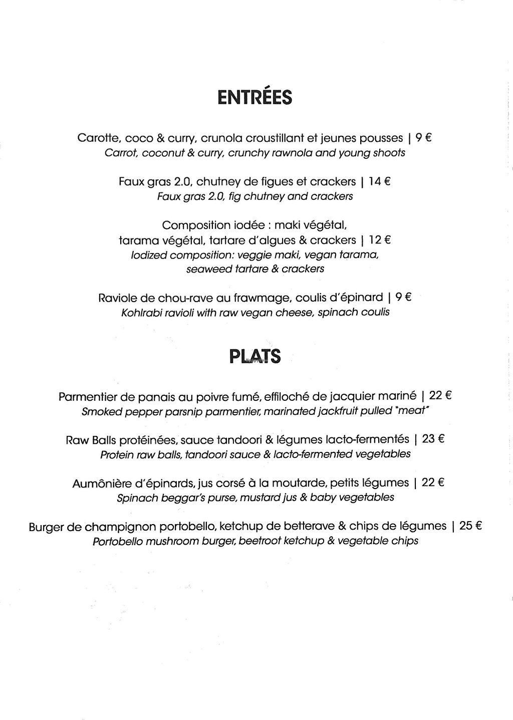 Raw food restaurant in Paris since 2013. Offers original cuisine in the form of small plates and daily specials. For example: vegan cheese platter, portobello mushroom burger, nori maki, raspberry tart, and chocolate raw cake. Evening booking suggested. Has a small area selling some groceries. No longer offers brunch as of December 2024, but does offer cooking workshops at a similar time. Open Mon-Tue 12:00-14:30, 19:00-22:30, Thu-Sat 12:00-14:30, 19:00-22:30.