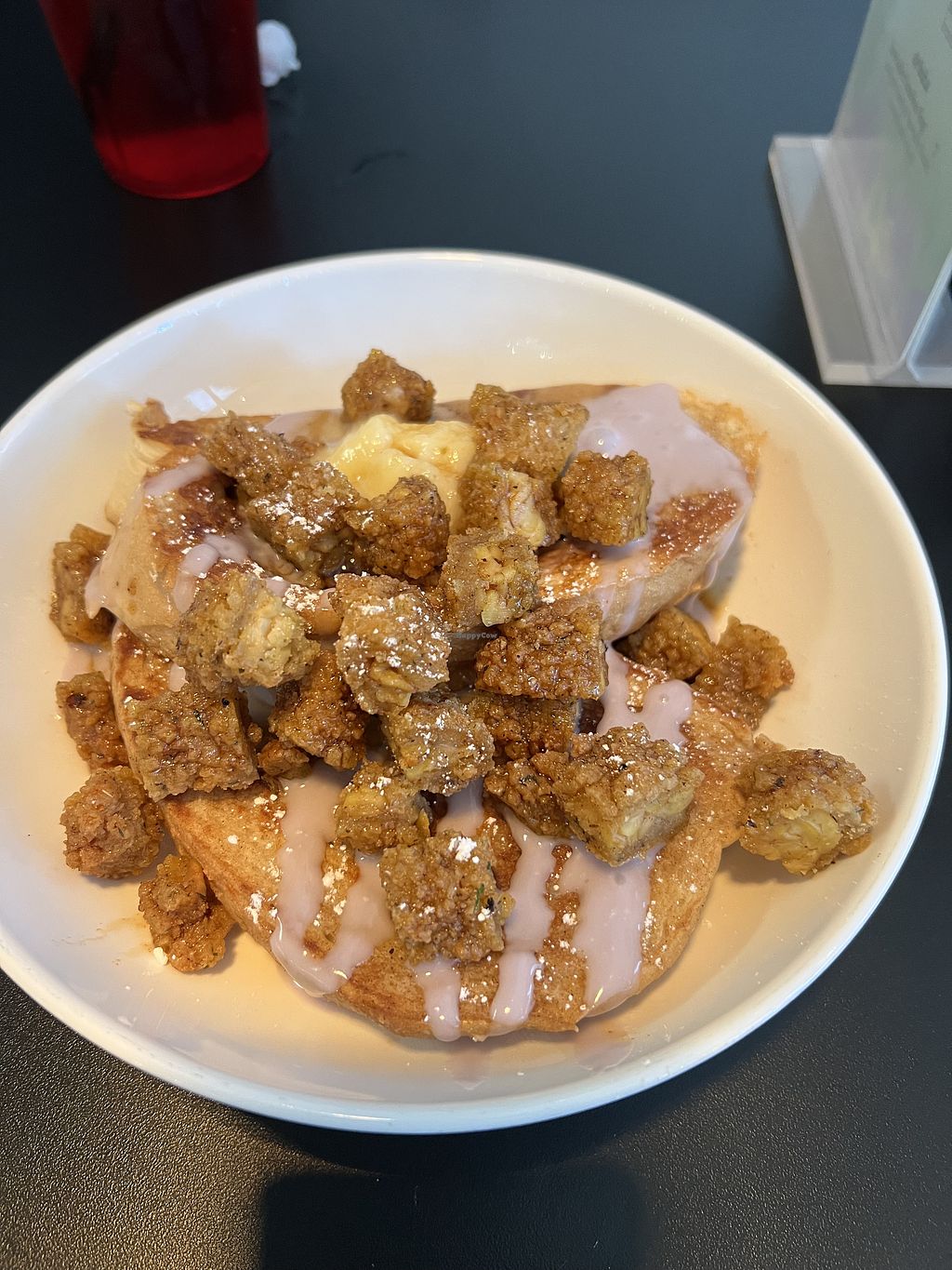 I traveled to Columbus this week for work and saw the great reviews here so decided to give it a shot. I ordered the “chicken” and French toast (seasonal flavor lemon lavender) and oh my goodness it was so delicious! I can see why this place is so highly rated. One of those meals where I wish I wasn’t so full so I can eat more. The chicken was nice and crispy and the French toast had so much flavor with the lemon lavender. Great service and very cute inside as well!