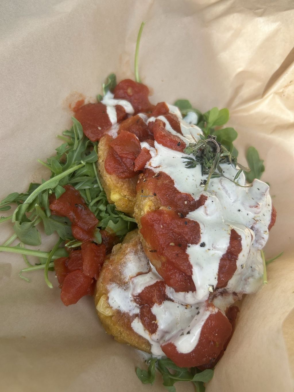 Usually a little Leary of food carts but the environment this was in was awesome picnic tables umbrellas lots of people multiple carts and this place rocked as far as vegan food. Flavors were off the charts