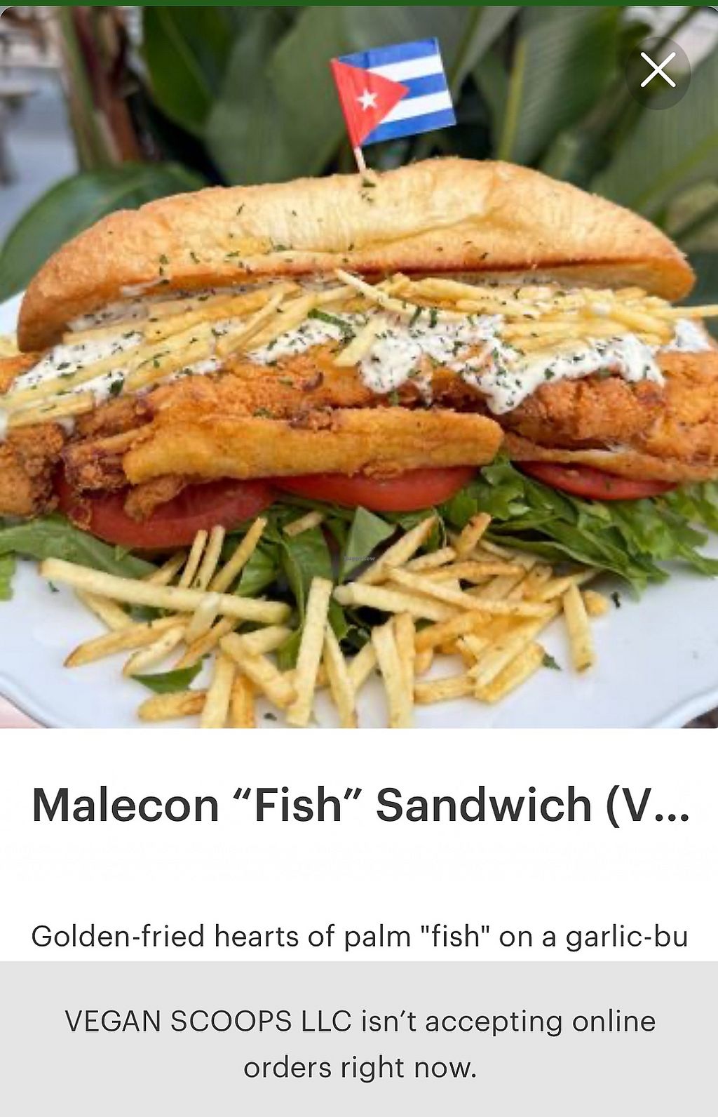 This place operates under two names: THE VEGAN SCOOPS and A Lo Vegano. That is why I was so excited to contemplate a spot for vegan Cuban food. However, the reality is that half of the menu is currently unavailable, which left me disappointed. I had a "fish" sandwich (made from battered and deep fried hearts of palm) that was actually quite good; they even prepared it for me on gluten-free bread. But the chips comes with “Fish” sandwich are the teeny tiny chips from a package (not REAL chips) and chocolate ice cream was a total sugar shock for me! SUGAR ATTACK & overdose! Way too sweet for my taste. Next, false advertisement on the menu, the real meal doesn’t look anything like shown on the menu. Last but not least, be prepared to wait for 55 mins or longer for your food. Slow service it seems like.