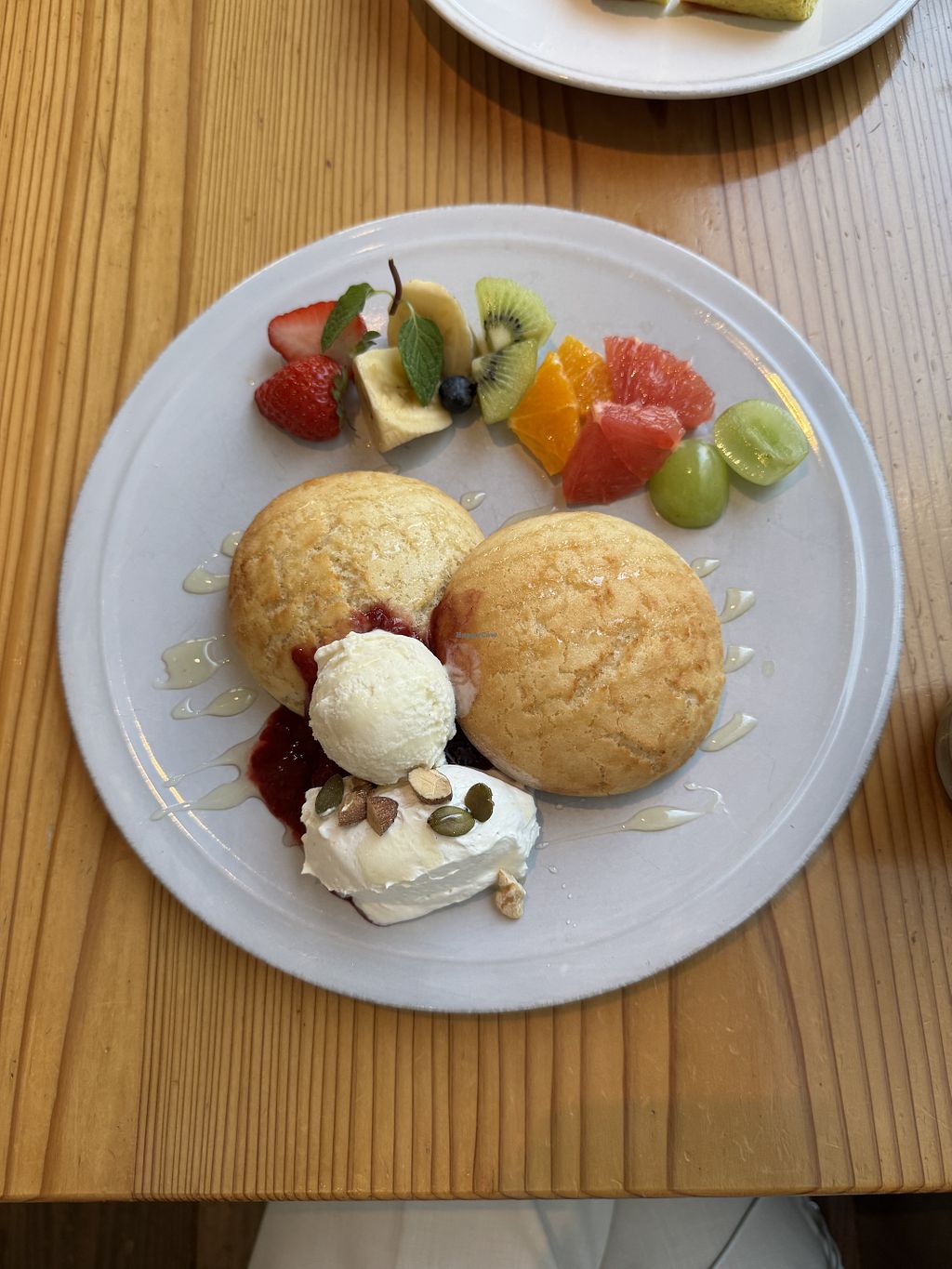 Read moreWe both got the “fluffy” pancakes, one with fruit and cream and the other was the seasonal pancakes with matcha cream and mochi. The pancakes are not at all similar to fluffy pancakes, they’re more similar to a scone (British definition of a scone), which isn’t a bad thing because they were really tasty especially with the toppings! Just don’t go in expecting wobbly, fluffy pancakes.