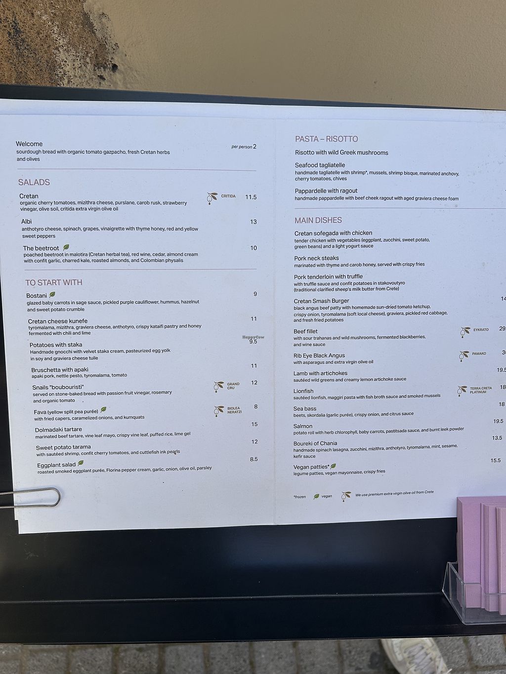 Serves meat, vegan options available. Restaurant offering a few clearly labeled vegan dishes. Options include fava, eggplant salad, bostani salad, and imam (stuffed eggplant). Business is closed for the season.
