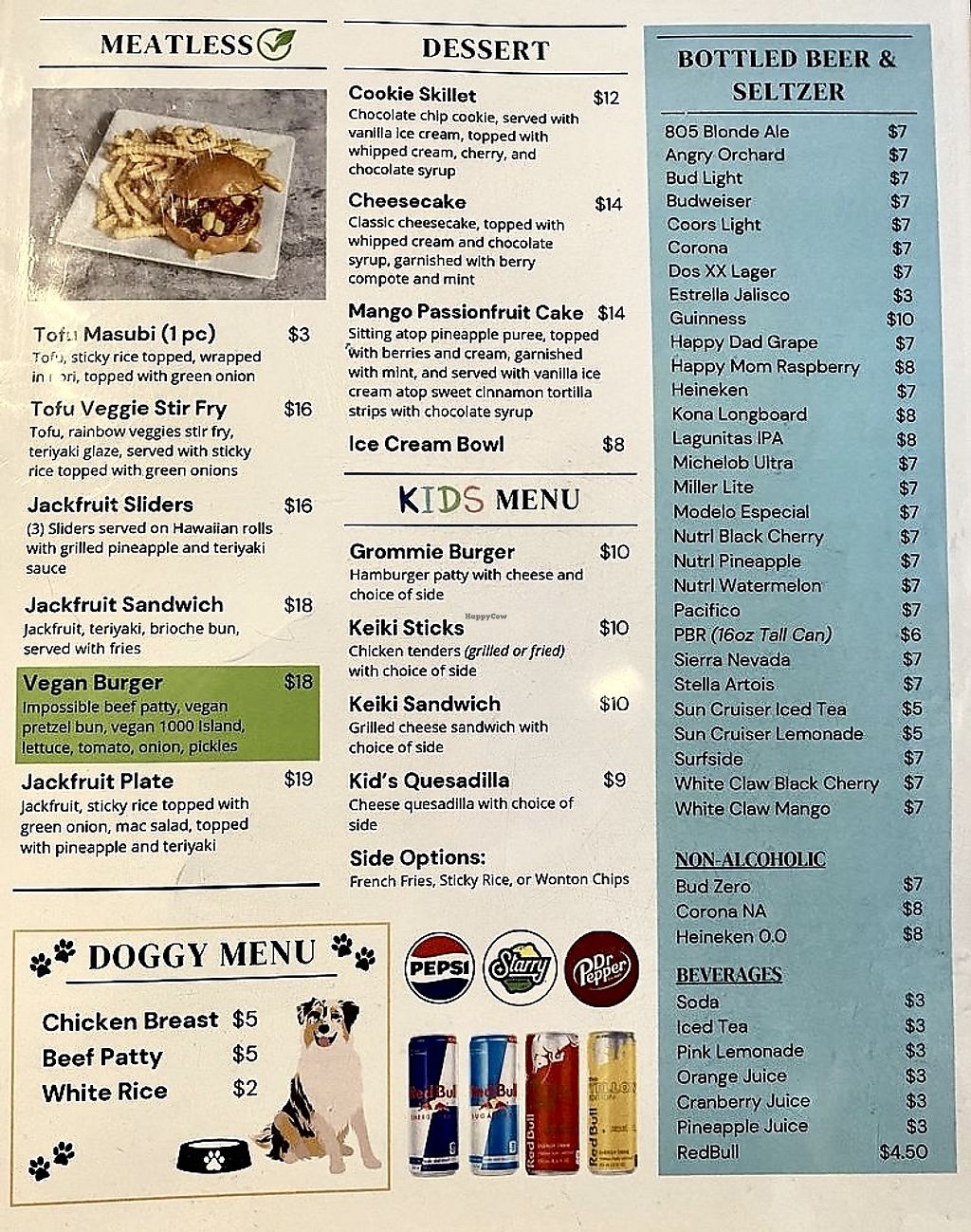 Serves meat, vegan options available. Restaurant with a “meatless” menu section. Vegan options are vegan burger, tofu masubi, tofu veggie stir fry., Restaurant with a “meatless” menu section. Vegan options are vegan burger, tofu masubi, tofu veggie stir fry. Open Mon 10:00am-1:00am, Tue-Fri 12:00pm-12:00am, Sat 12:00pm-2:00am, Sun 10:00am-2:00am.
