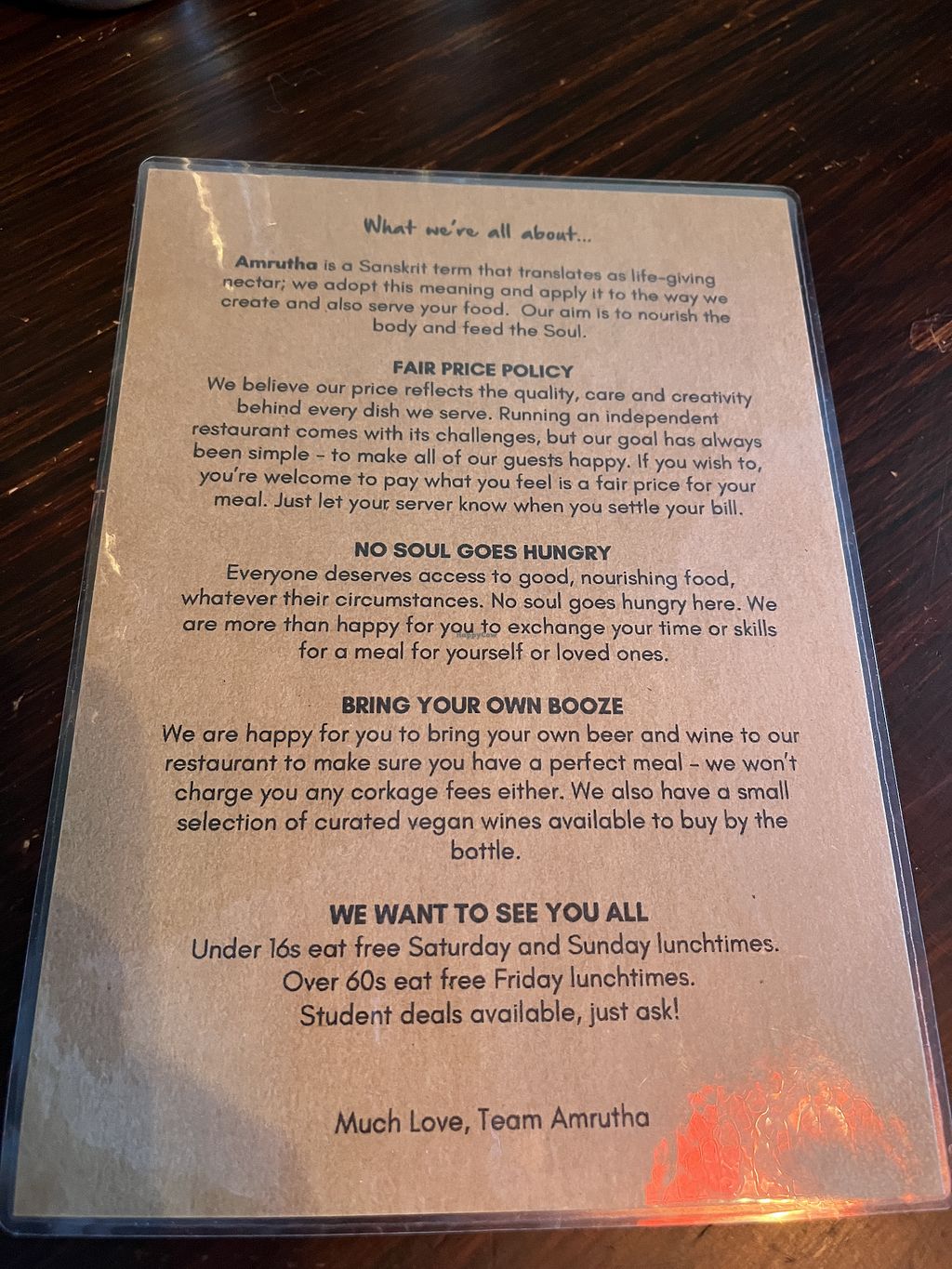 I loved it here! Three of us shared the sharing menu with unlimited refills. The curries and pakora were amazing, and we enjoyed tea after overeating. Our waiter Zack was great, super friendly and helpful and made our experience really lovely. It’s BYOB and the general feel and ethos of Amrutha is warm and positive
