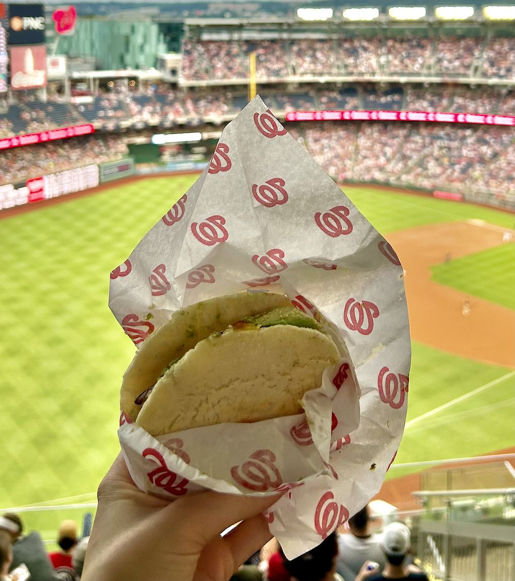 There are very few vegan options at Nats park and the vegan arepa from Arepa Zone is a perfect ballpark meal! The corn masa, fried plantain, and avocado combo is delicious