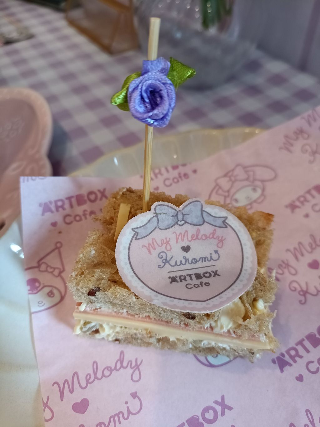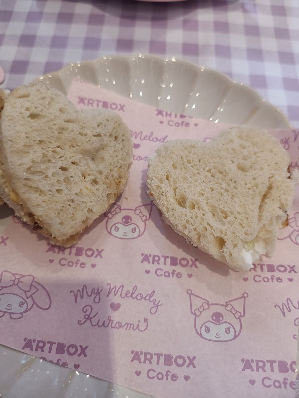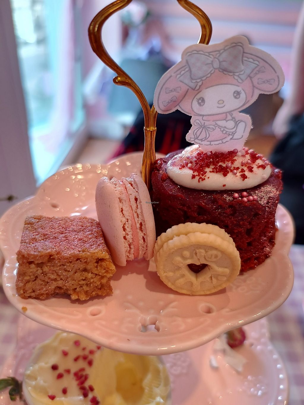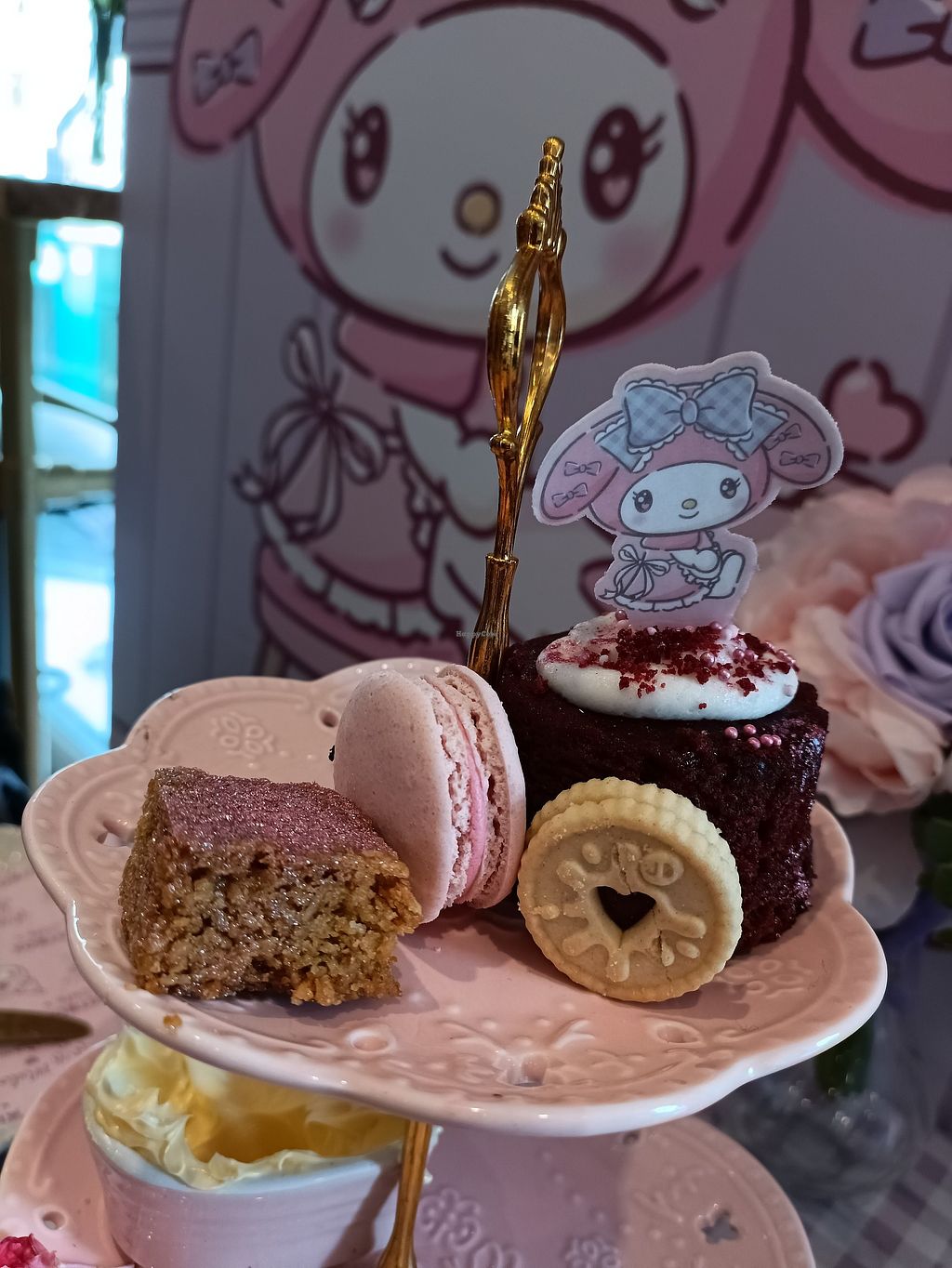 We got the vegan afternoon tea, kuromi and my melody were the options so we got both. Kuromi's side was brown bread sandwiches and chocolate coffee cake, my melody was white bread sandwiches and red velvet cake.