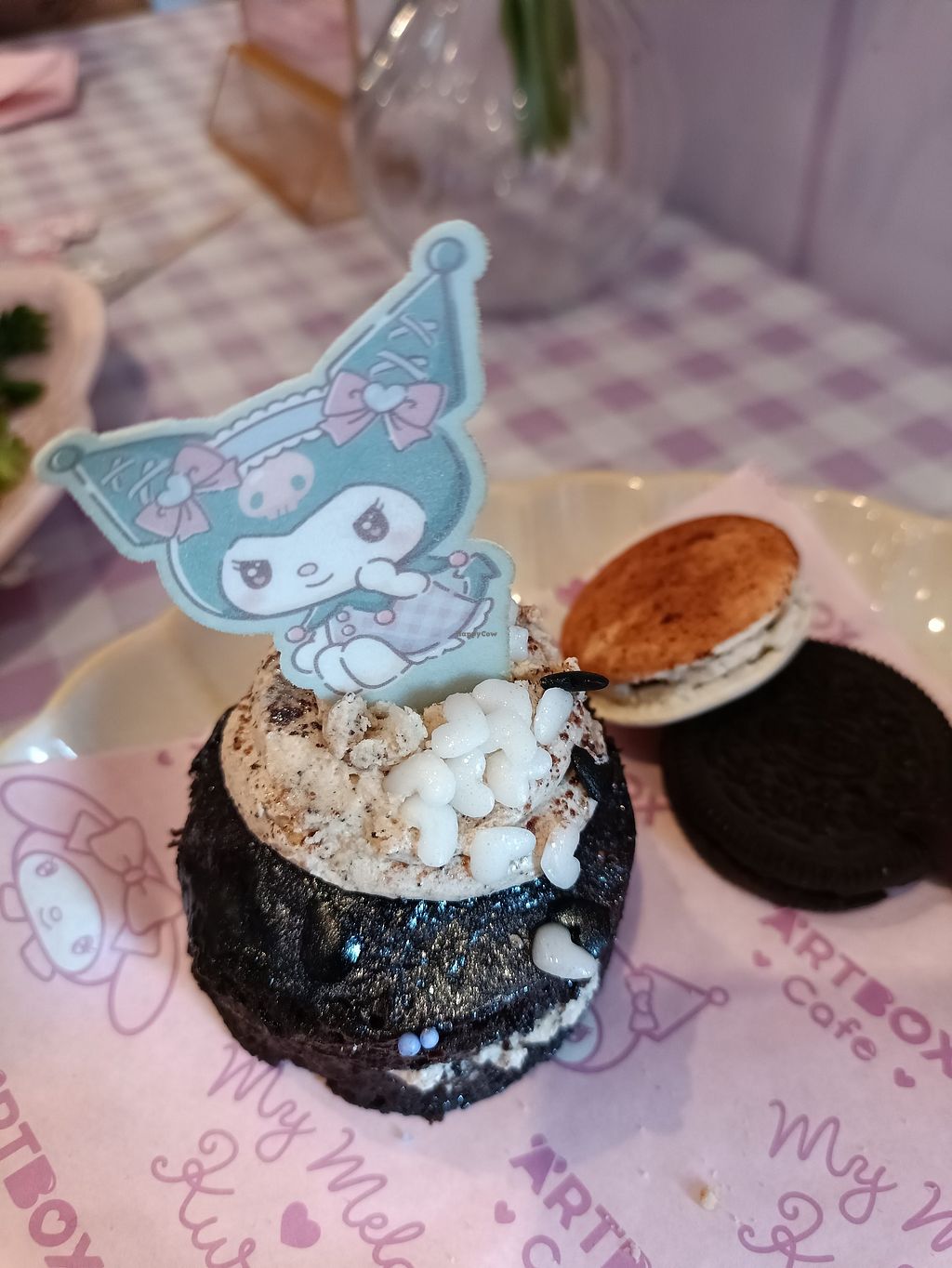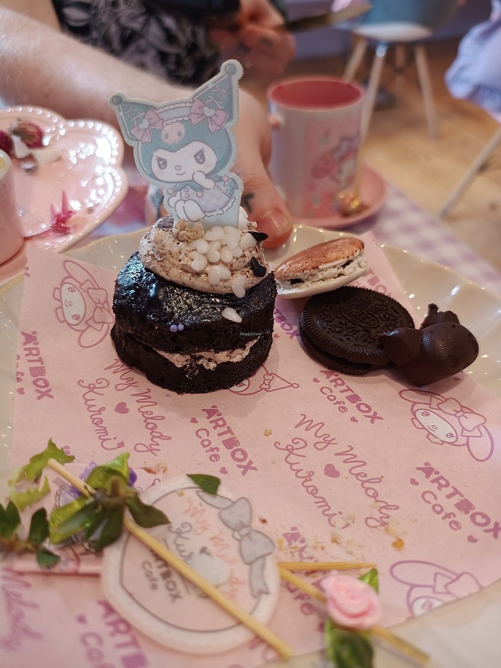 The Kuromi sweet treats were a chocolate and coffee cake, a chocolate macaron, an Oreo, and a piece of Kuromi shaped chocolate. The MyMelody ones were a red velvet cake, a strawberry macaron, a coconut flapjack, and a mini Jammy Dodger.