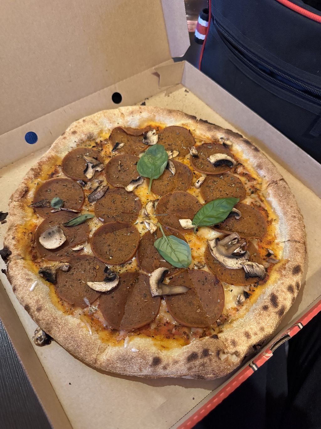 Vegan pizza with tomato sauce, red onions, mushrooms, pineapple and ve…