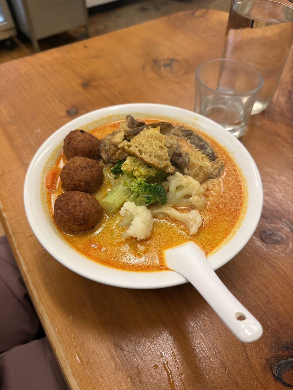 We had 3 ppl and tried laksa with mock duck, laksa with veggie balls and fried rice with mock duck. All delicious, laksa broth especially! In mock duck laksa we changed noodles to rice noodles to get gluten free option.