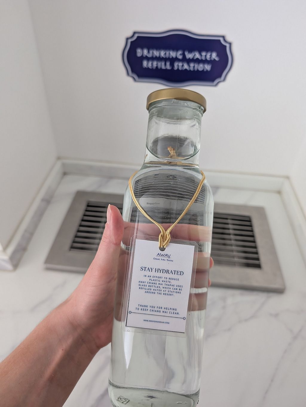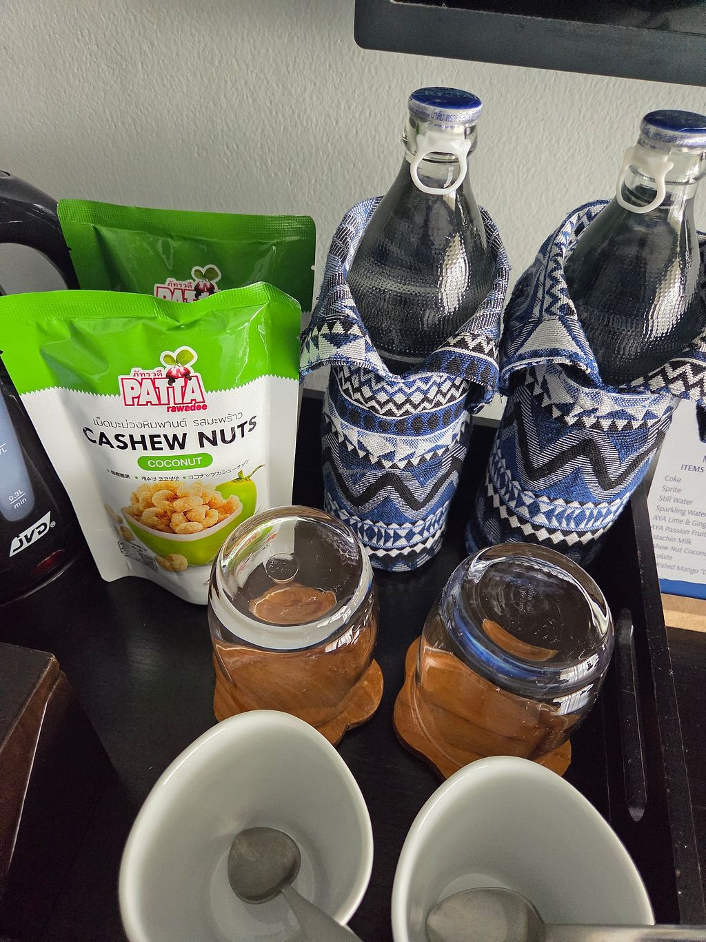 Room refreshments are topped up daily, and there's also a drinking water tap in the corridor for refilling. Things like drinking water, coffee pods, are complementary but there's a mini-bar system for other items. There's a fridge in your room. It'd be nice if they provided plant milk in the room for drinks too.