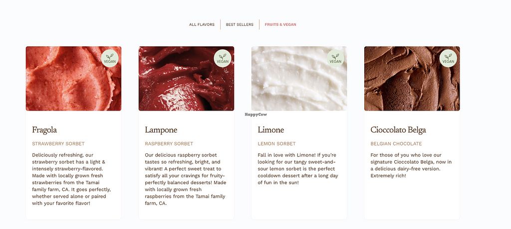Gelato shop offering one vegan gelato flavor, Belgian chocolate, and three vegan sorbet flavors: strawberry, raspberry, and lemon. Open Mon-Sat 11:00am-11:00am, Sun 10:30am-11:00am. More