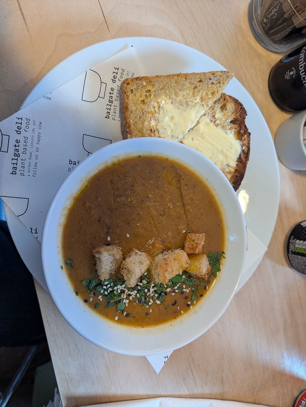The welcome received from staff was lovely. The deli was busy but we had a lovely chat with the owner & he was so helpful finding a table for the 4 of us. Our soups and Dahl were 5 star and good portion sized too. We took some carrot cake home-moist,tasty and delicious