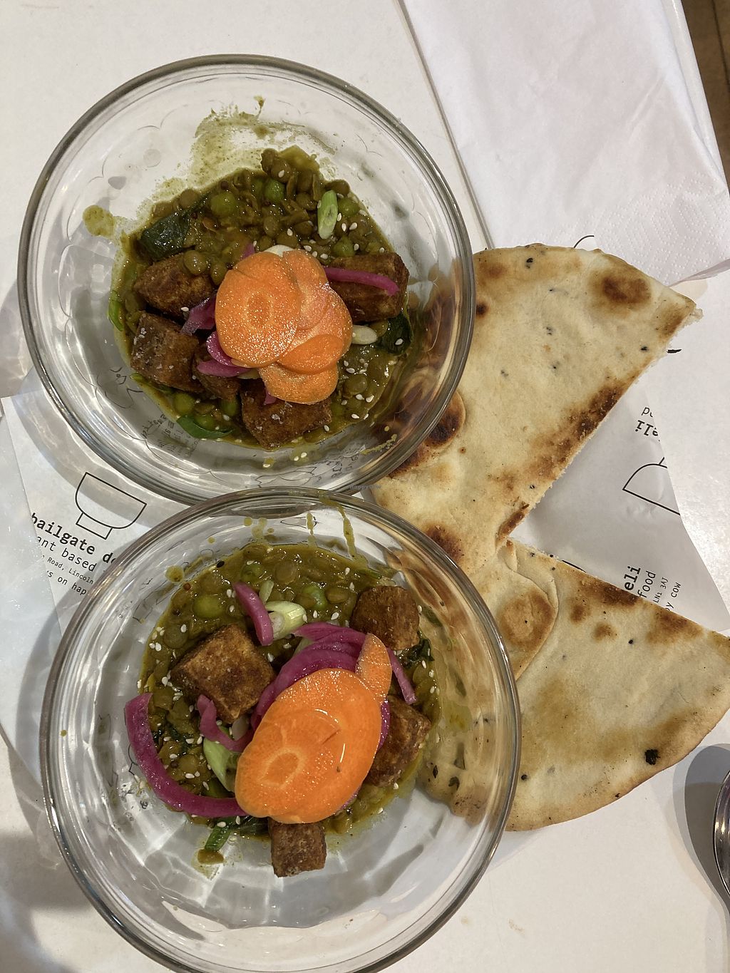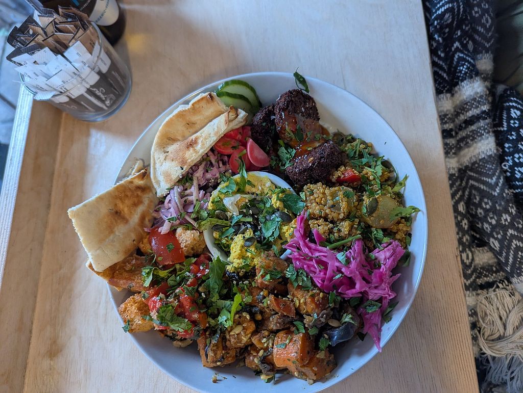 Had the falafel salad flatbread with vegan tzatziki, sliced carrot, cous cous, hummus, and more - was so filling and absolutely delicious!