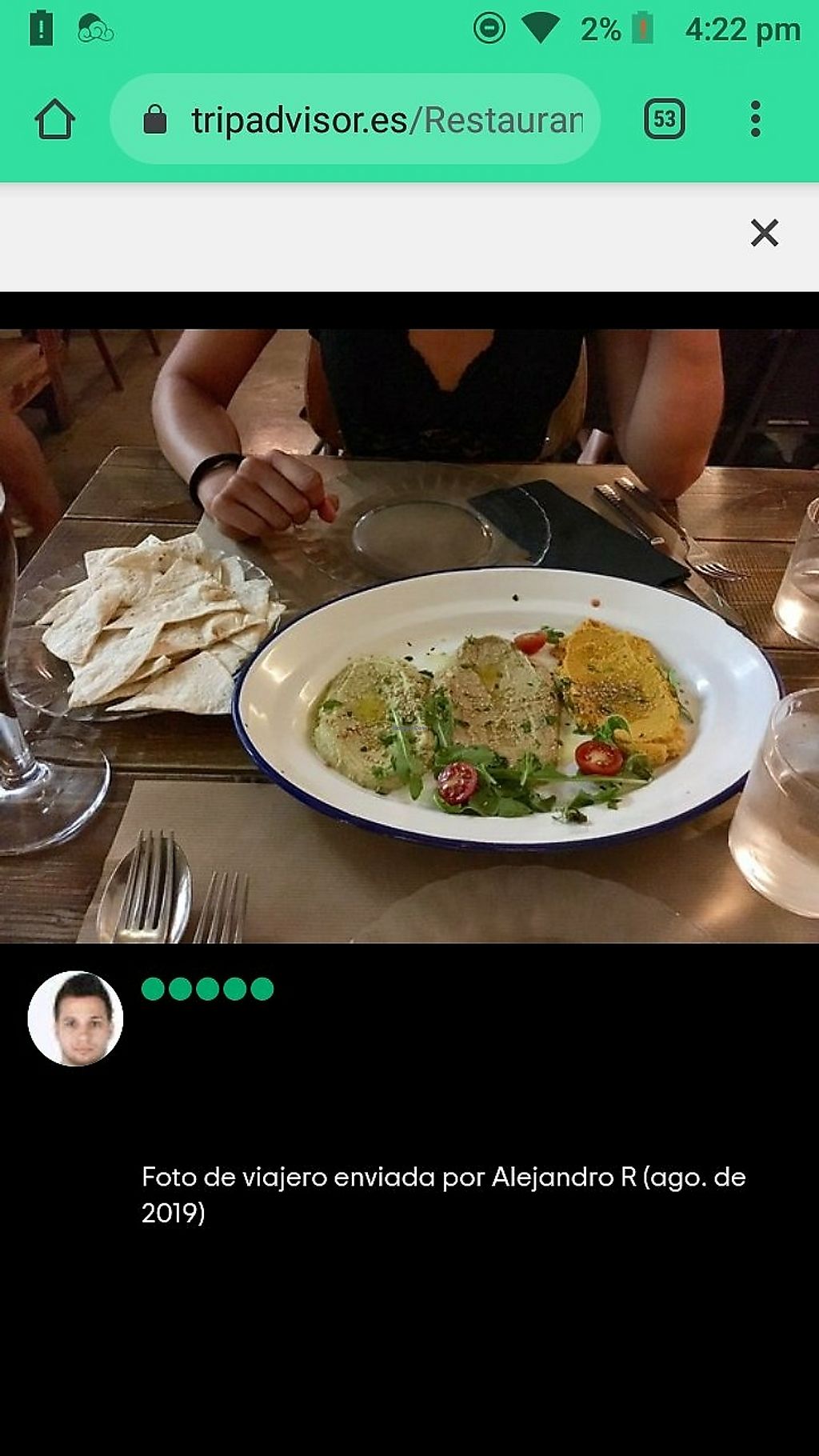 Read moreEn mi caso pedimos los hummus de lentejas, calabaza y garbanzos que estaban increíbles, y la hamburguesa vegana, que si bien estuvo buena para mí no fue la mejor que he tomado, pero era muy abundante y tenía unas patatas deliciosas.