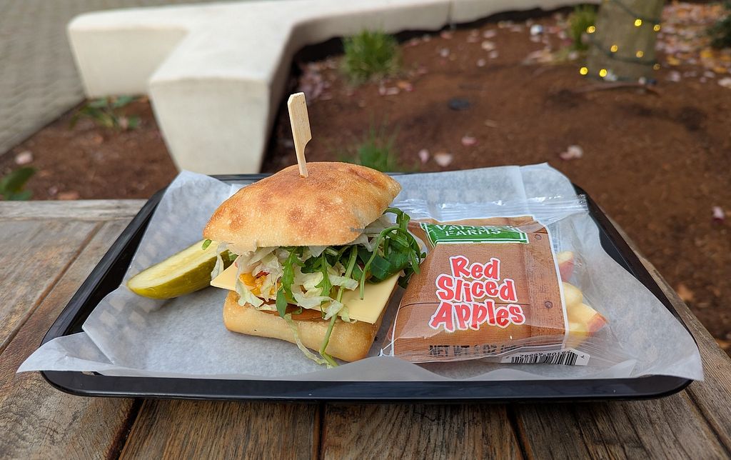 Of the several vegan sandwiches, I chose the Veggie Italian, which included vegan salami and ham, vegan provolone, shredded lettuce, tomato, onion, pickled peppers, dijonnaise, and an oil & vinegar drizzle on a ciabatta hoagie. It was messy, but tasty. It was served with a zesty dill pickle spear. I didn't want a single-use bag of chips, so I chose sliced apples instead. Ironically, those were also served in a single-use plastic bag. The chocolate chip sea salt cookie was a little dry, but I still enjoyed it.