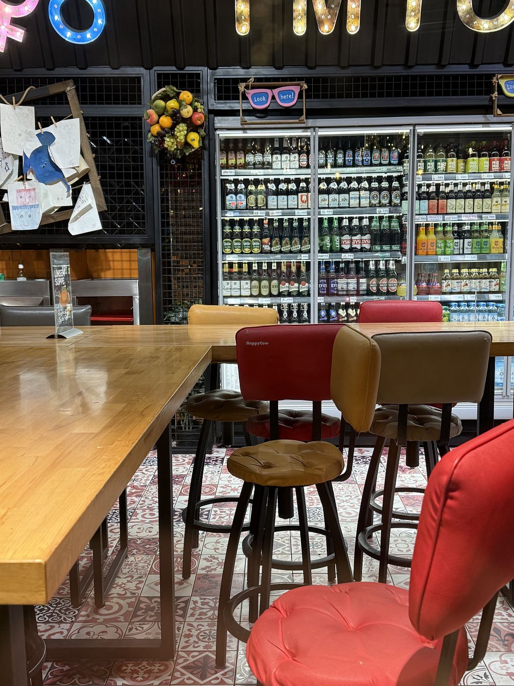 In nice area of town directly at subway stop. Friendly and bright; they do have some token vegan items. Fast food, large choice of soft drinks; inside seating.