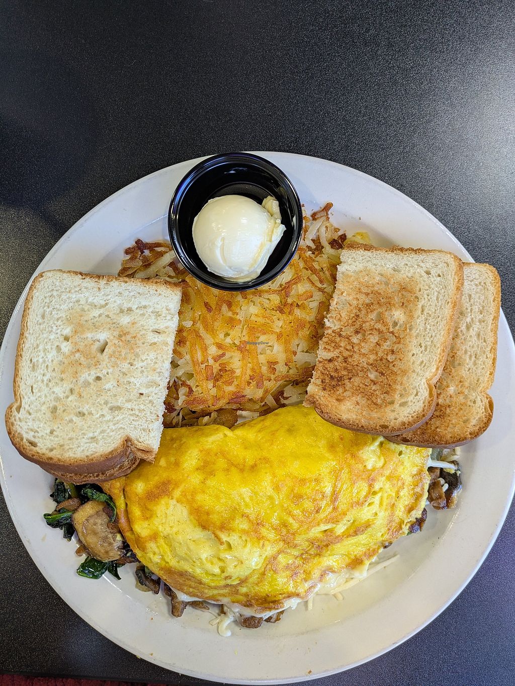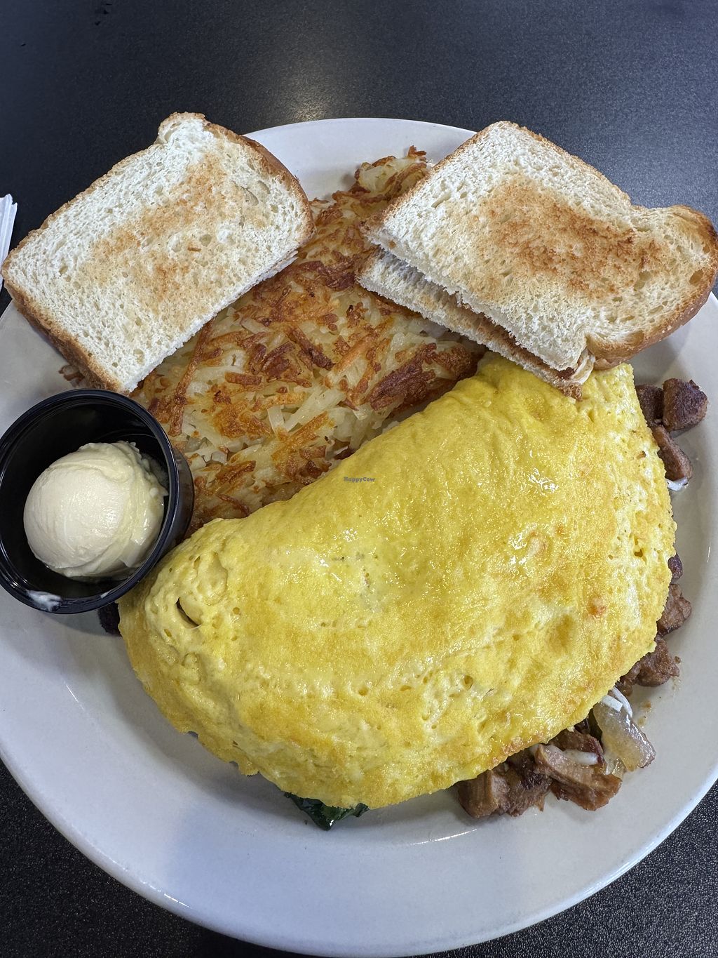 Yummy omelet, melty cheese, spinach, mushrooms. Grits, hash brown. Perfect breakfast/brunch place if you’re vegan eating with not vegan eaters