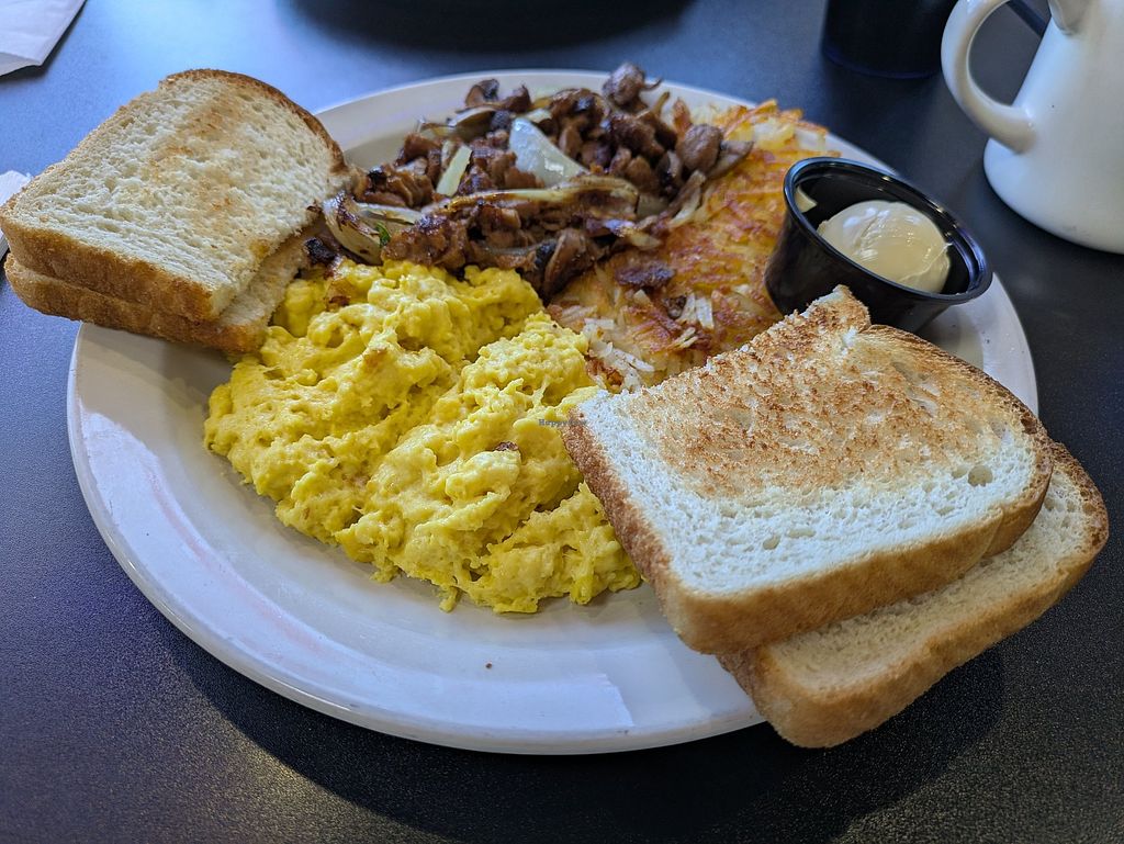The vegan omelet and dinner potatoes were delicious and very flavorful. Large vegan section on the menu. #Veganuary