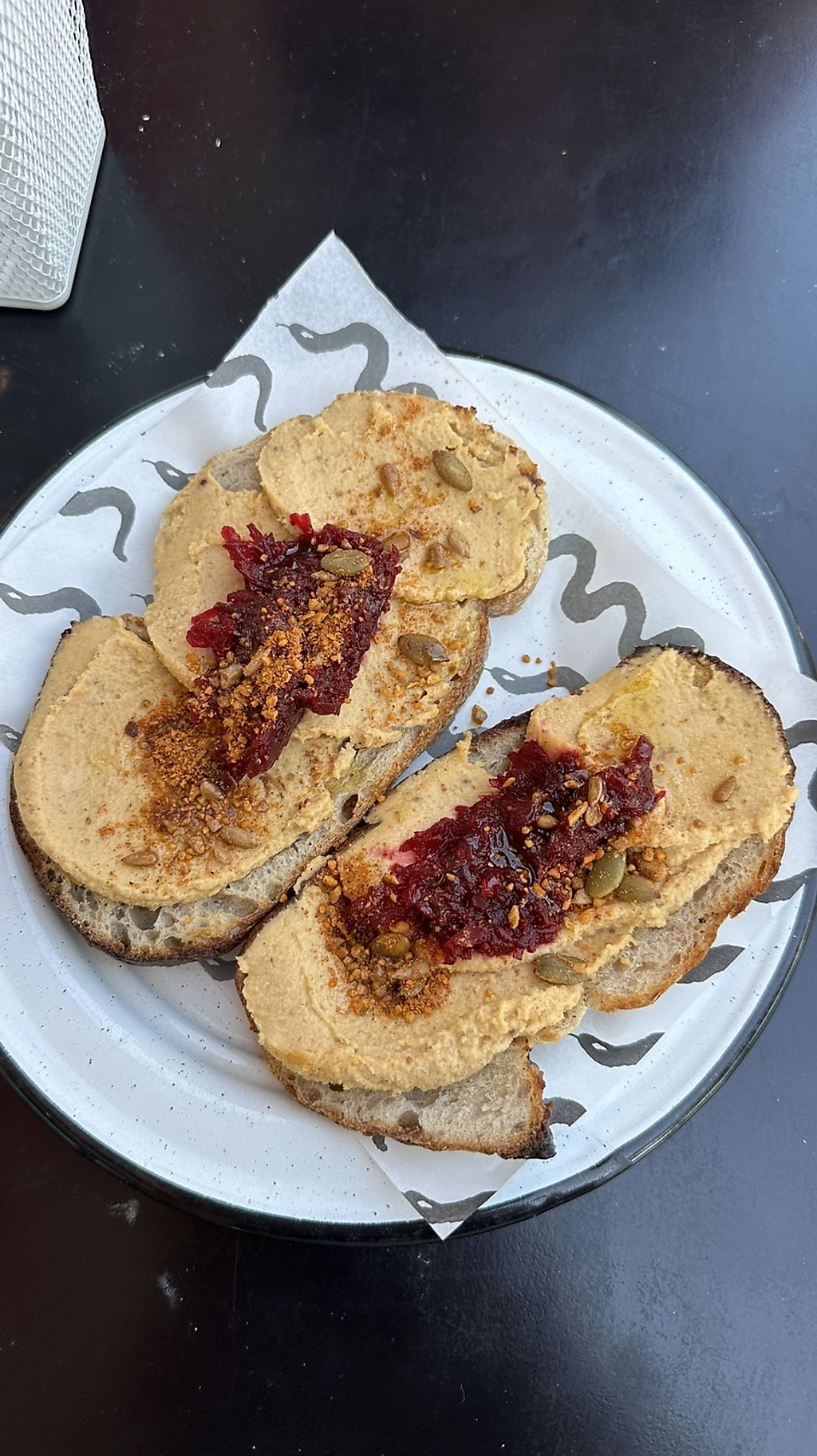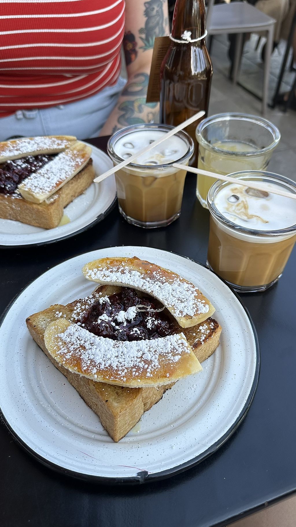 Hay muchas opciones veganas y veganizables. Probé las tostadas francesas que estaban increíblemente ricas, un pancito con queso(s) y pesto de tomate deshidratado que recomiendo 100%. Para tomar pedí un salted caramel latte que estaba interesante ya que el sabor es exactamente lo que uno espera al pedir algo así, muy rico. Todo súper contundente a pesar de que las fotos no lo parezcan.