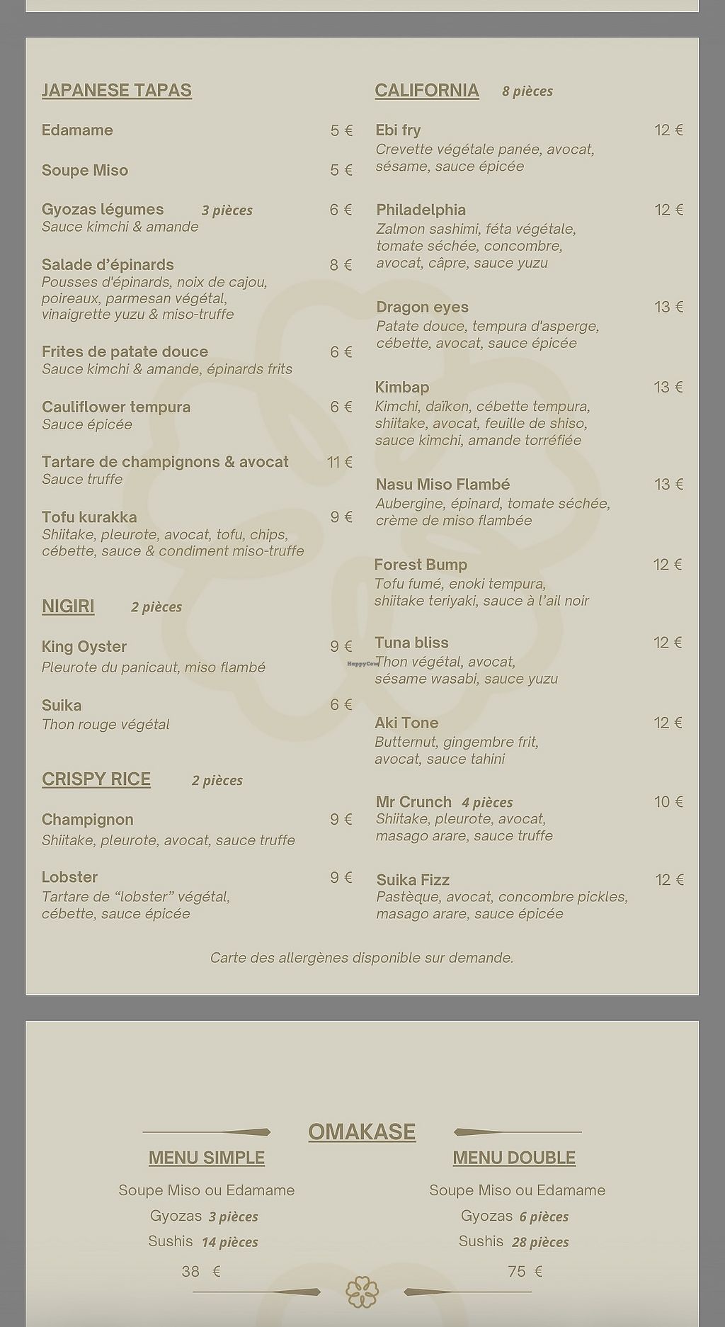 Bon restaurant qui propose des sushis révisés vegan. Nous avons pris le menu duo, des tempuras de chou fleur, une mousse au chocolat et une à la banane. Les sushis n’imitent pas vraiment le goût des poissons ou des crustacés, ce n’est pas le but