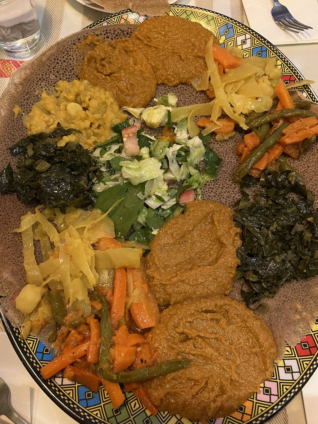 We got the veggie revenge to go with gluten free injera. Everything was delicious. Our order was ready right on time, everyone inside was friendly and helpful. The food was still warm when we got home and it was just the right amount. Highly recommend.