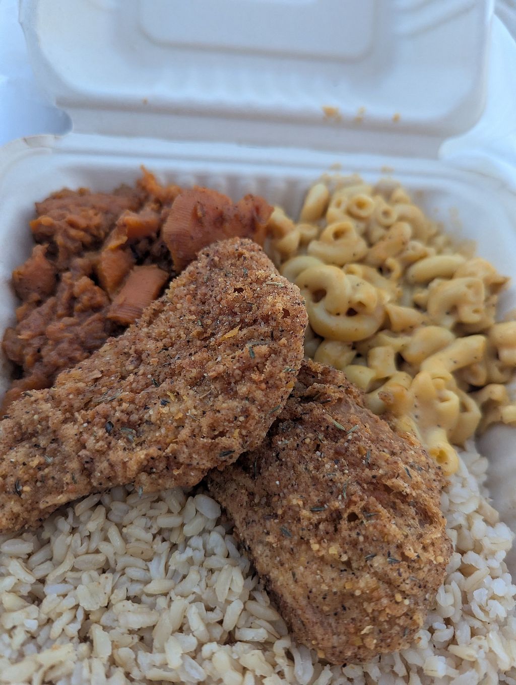 We made 2 visits to come here as it was the only vegan restaurant in the area. Seemed great for lunch but for the dinner visit, they were out of the chicken, burgers, brussels sprouts and apple juice for smoothies. Meal boxes are huge but all the mains are fried. Some people may call it comfort food but it was just unhealthy. We asked for ketchup but were told that only one small packet is free, then there is a charge for any more. Food is served in single use disposible containers.