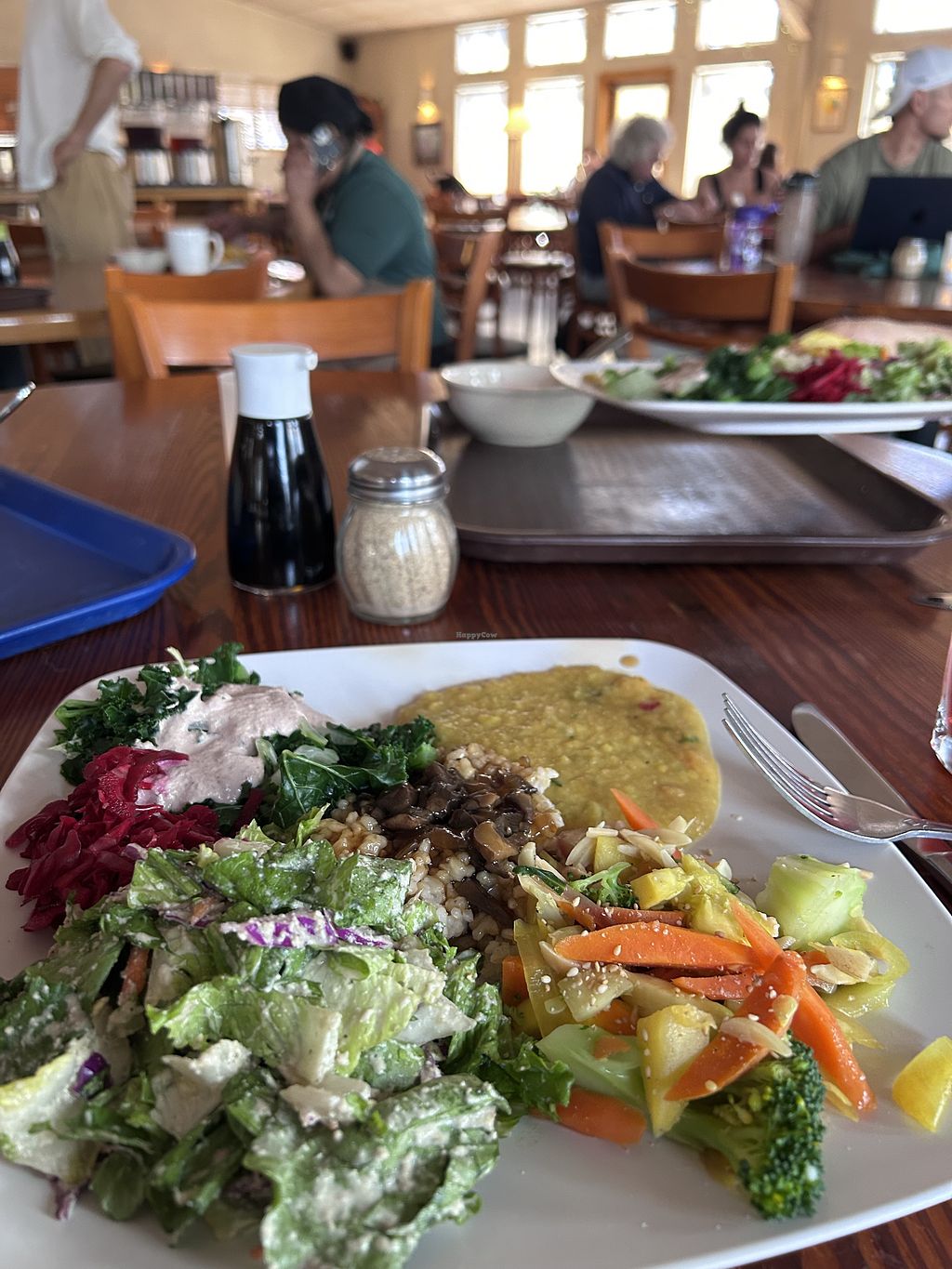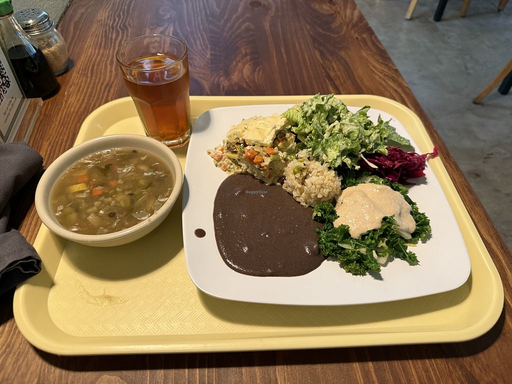 Had a happy lunch, which consisted of legumes, salad with house dressing, leafy greens, homemade tortilla soft taco, veggie soup, and hibiscus tea. Full of nice people and beautiful scenery!
