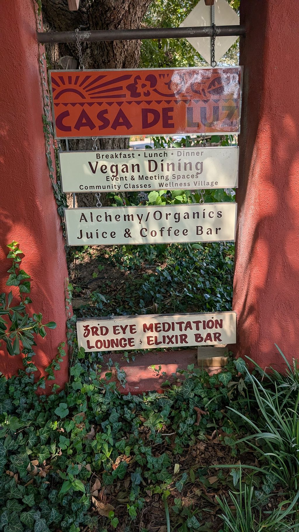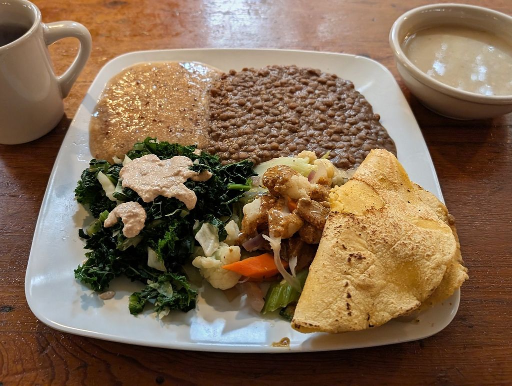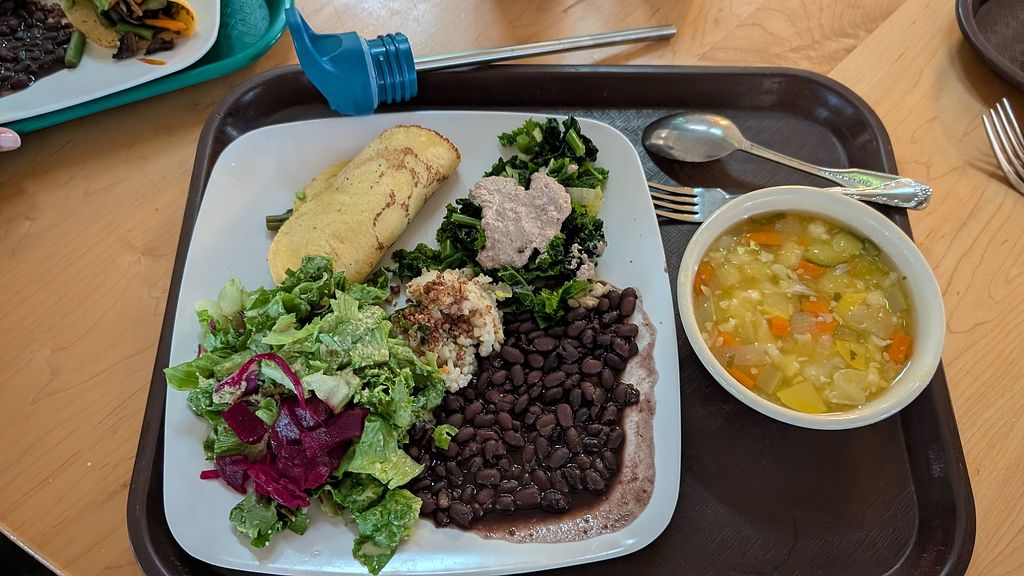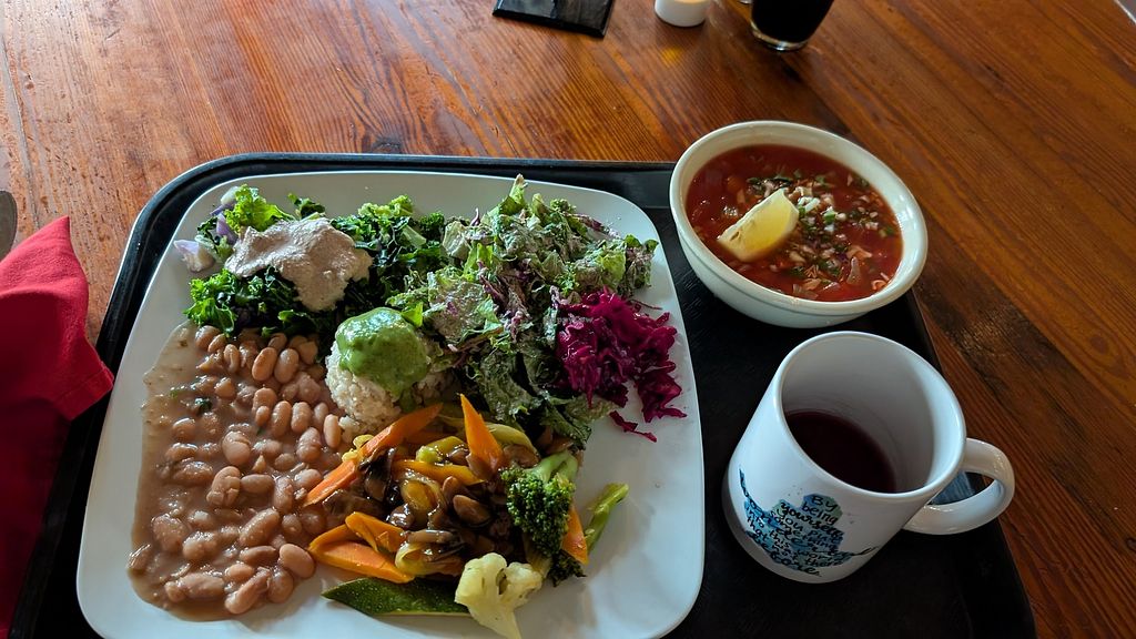 Soup, iced tea, and platter with grains/legumes/salad/veggies