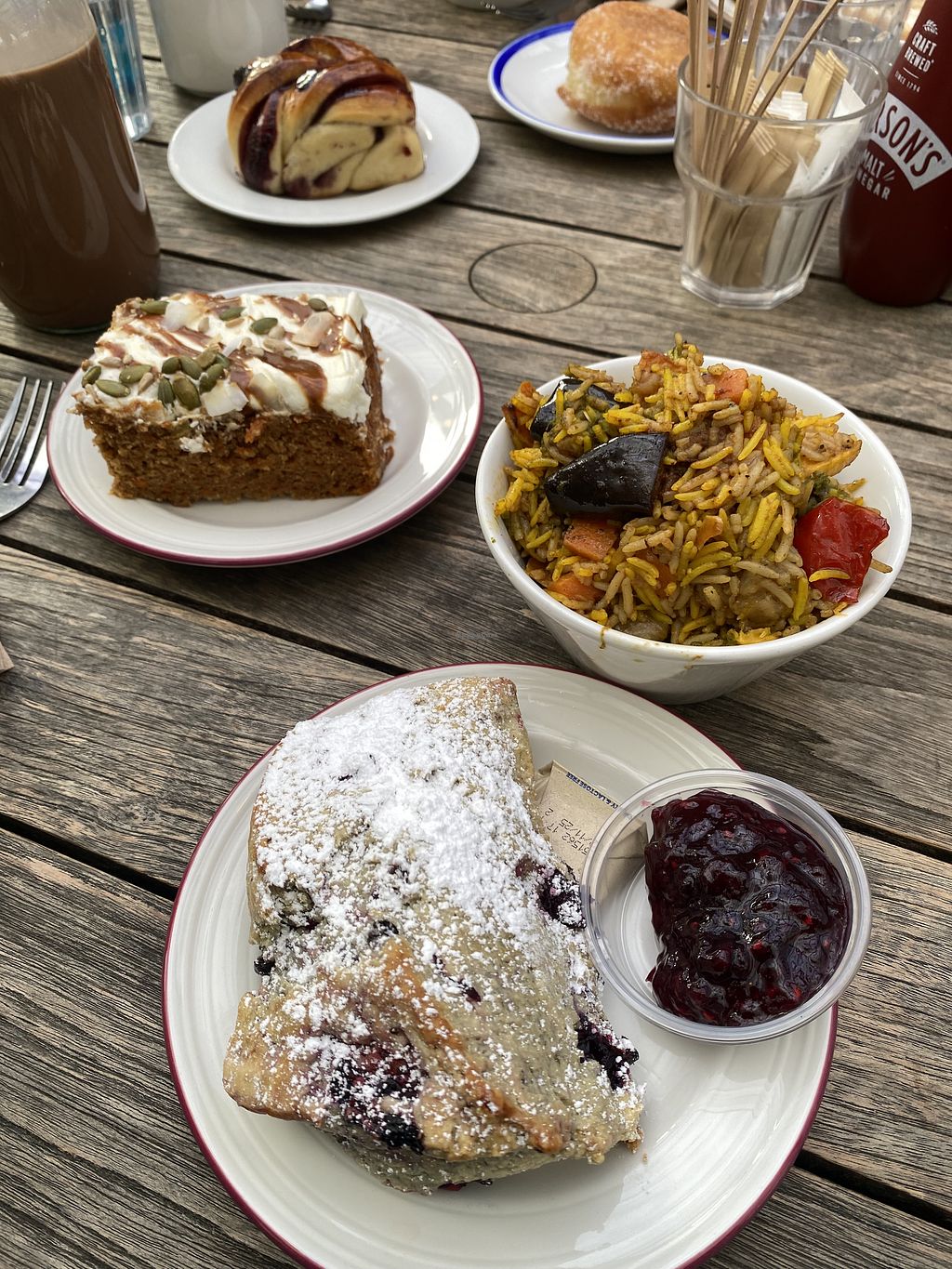 Great menu and choice. The perfect vegan lunch. I had a biryani and giant onion bhaji. Vegan sausage rolls, salads and cakes looked immense as well.