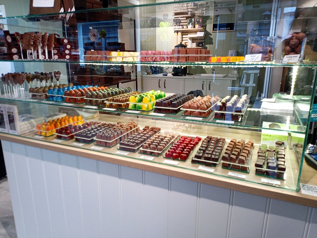 Artisanal chocolate store offering a selection of vegan and gluten-free products, including dark chocolates with unique flavors such as chili spice. Features various shapes and fillings. Open Mon 10:00am-7:00am, Tue-Sat 10:00am-7:00pm, Sun 10:00am-6:00pm. Closed Sun.