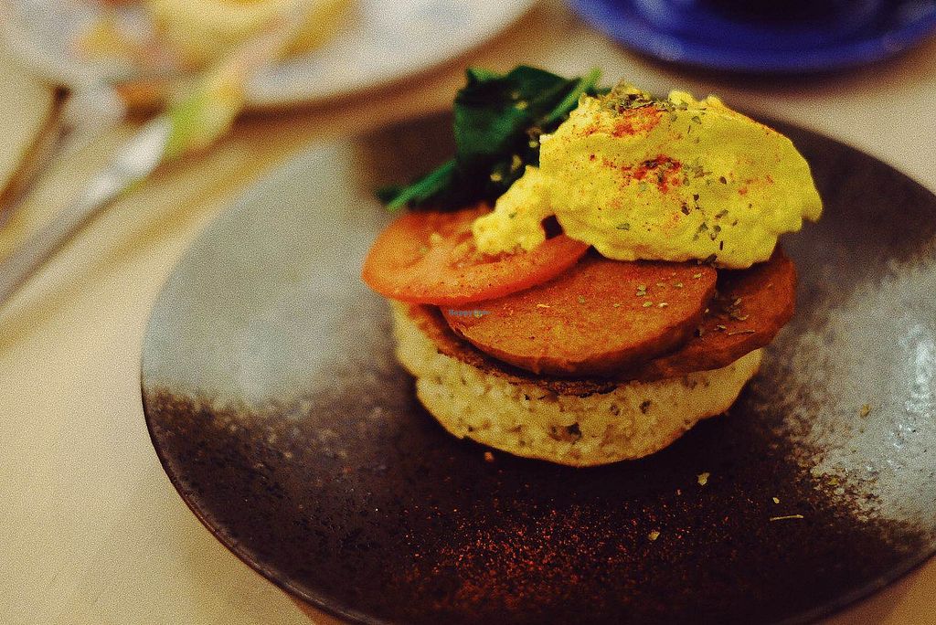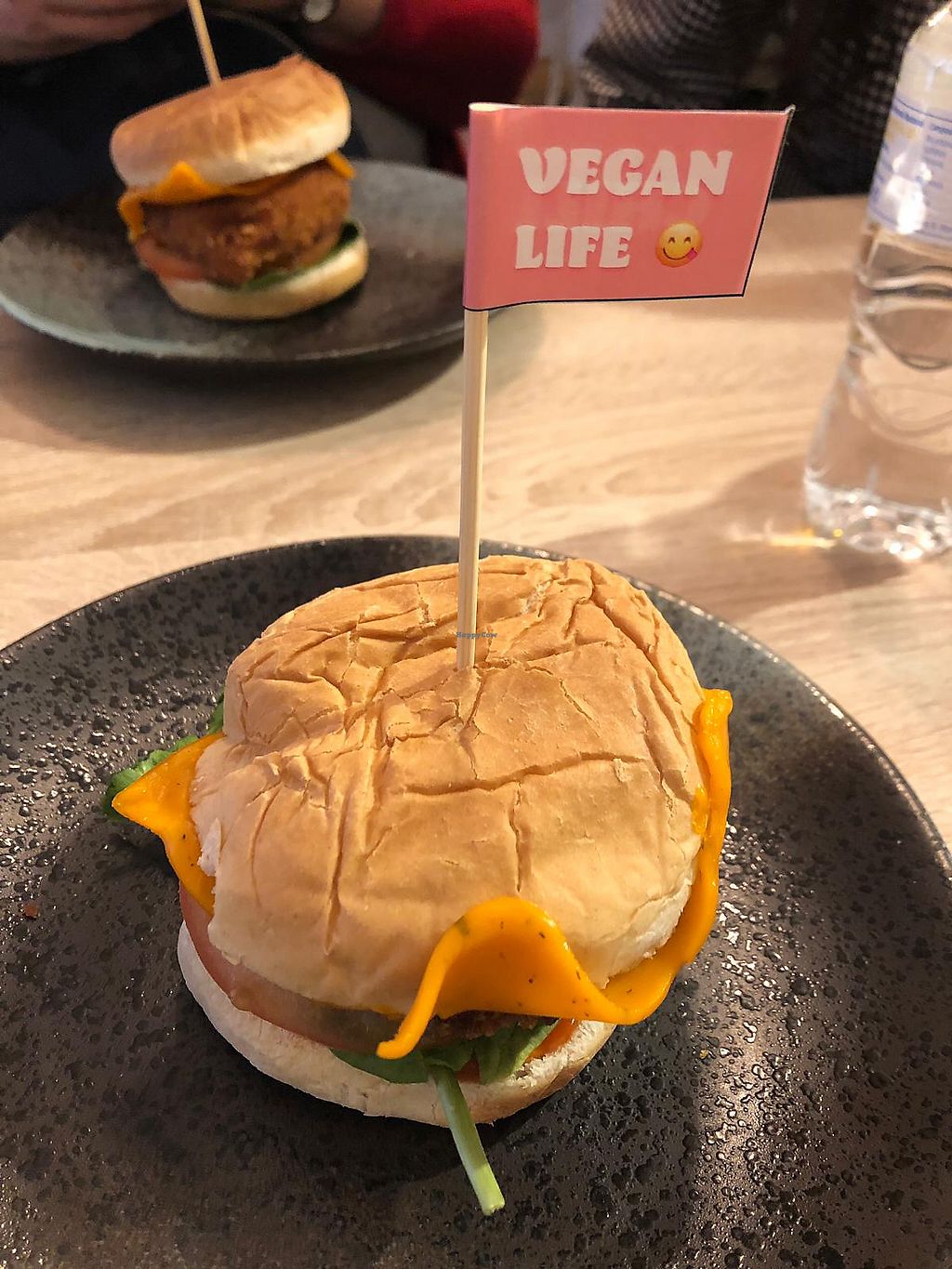 Burger with vegan cheese, fried patty, pickles, lettuce and tomato