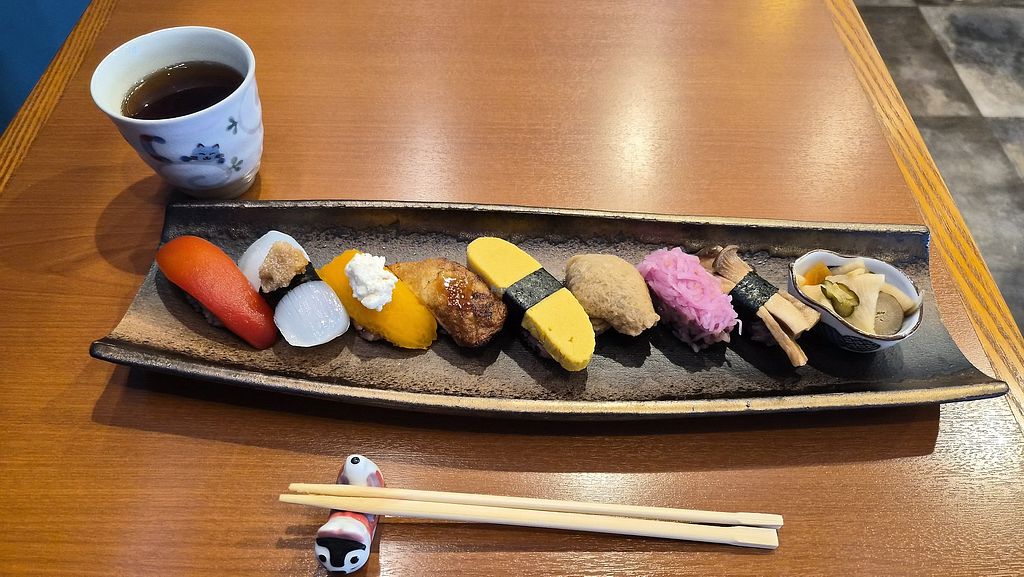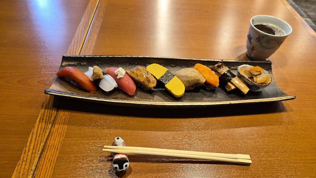 Small fully vegan Sushi restaurant in Kamakura. We came in and were blown away by the interior. We ordered the 12-piece Sushi plate and the cinnamon tea and were not disappointed - it was a completely new experience for us since we have never eaten such delicious vegan Sushi before - each creation was unique. Everyone who believes that Sushi has to taste like fish is absolutely wrong!! 🥰
