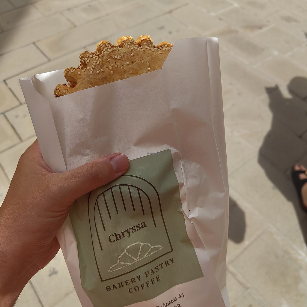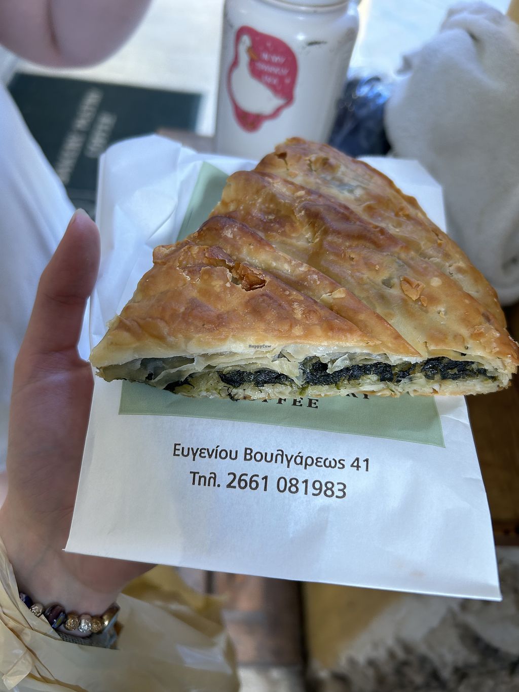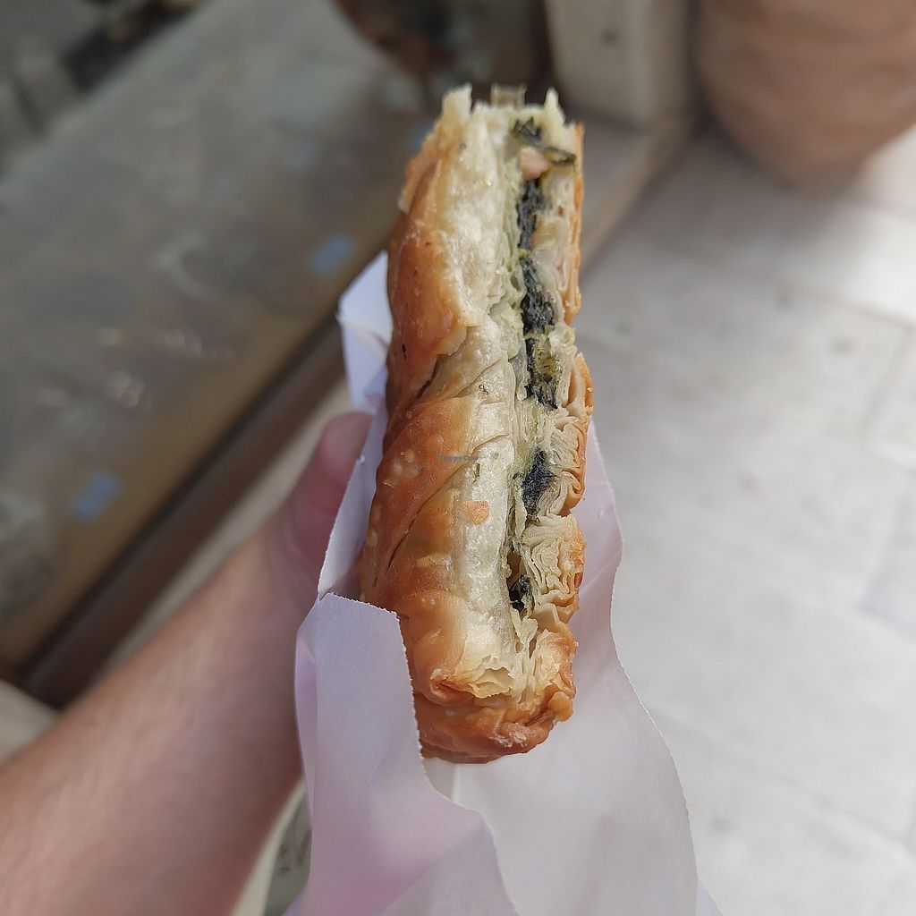 We went in with no expectations but they actually had some vegan items (listed in English too). We got the vegan spinach pie which they heated up for us. It was also fairly cheap at only 2.50€. They also had vegan apple pies available! We went in the evening and there wasn‘t much left, so I am assuming that there should be more vegan options if you go earlier in the day😄