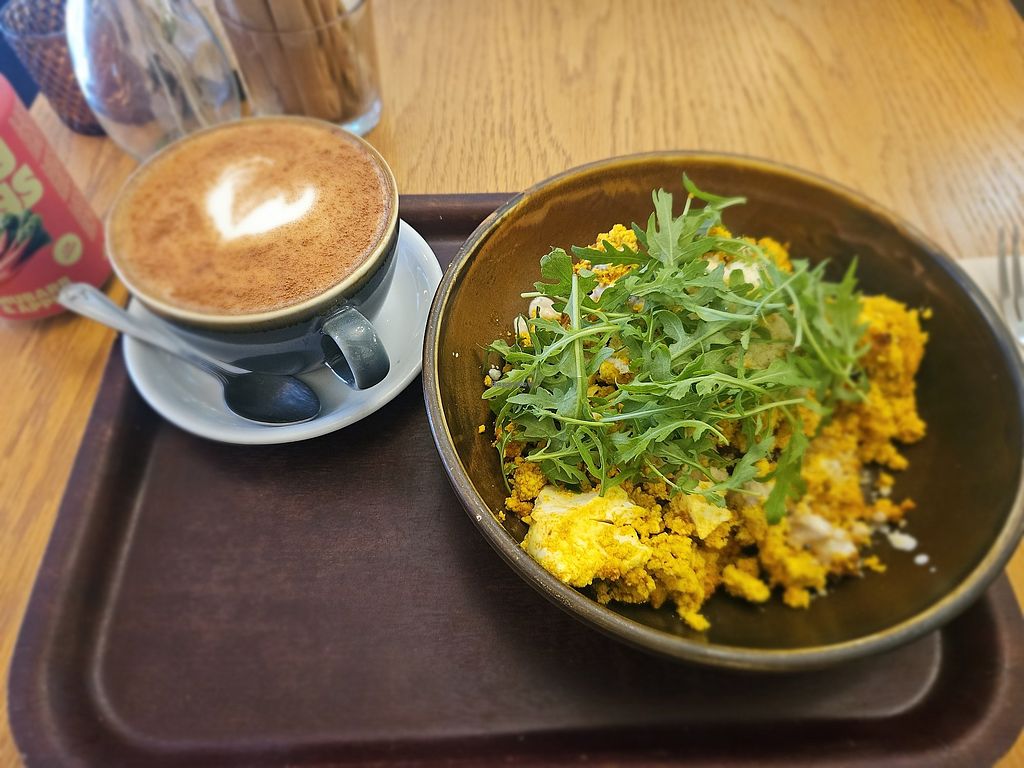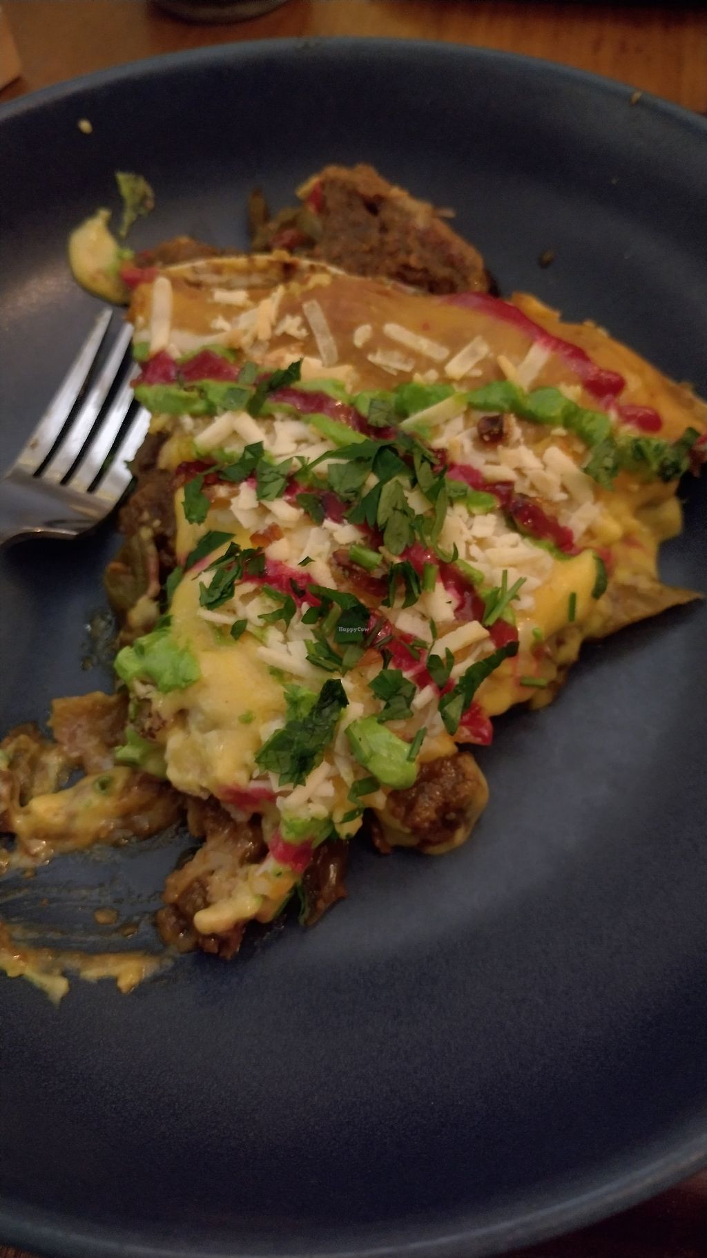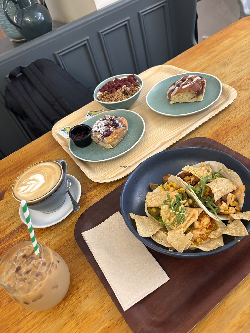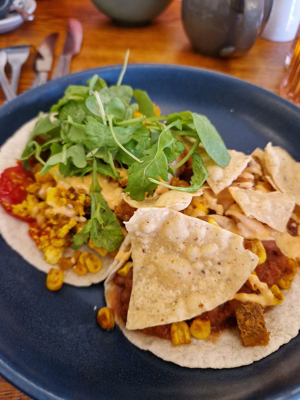 Breakfast options. I had the scrambled tofu nachos. We shared the past…