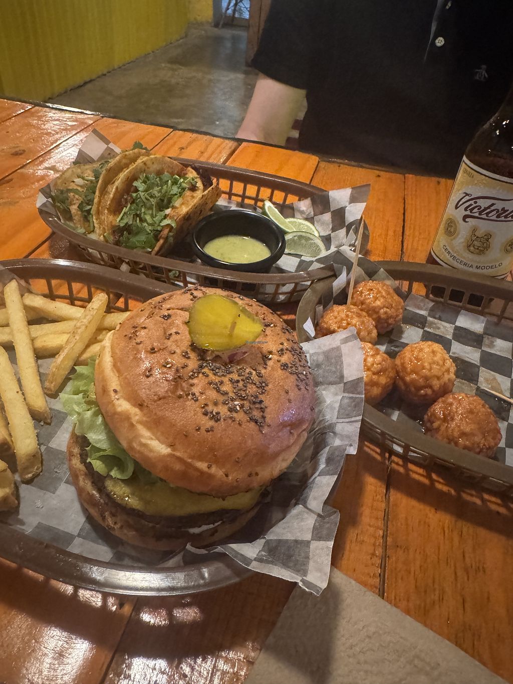 We ate here twice. The first night was great—I loved the pozole and my partner got the virria tacos, also bomb. And the kibis are excellent. The second night was sadly kind of a bummer. I don’t recommend los tacos de chicharrón unfortunately—the tofu chicharrón was so hard to eat (fried super super hard). My partner liked his meal (one of the burgers). The YOLO app can be skipped (get the kibis instead!). Overall I think this place is pretty good, maybe it was an off night or maybe some dishes are just better than others. Also they were playing really good music one night and service was lovely.