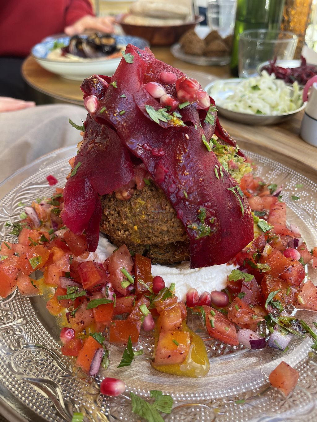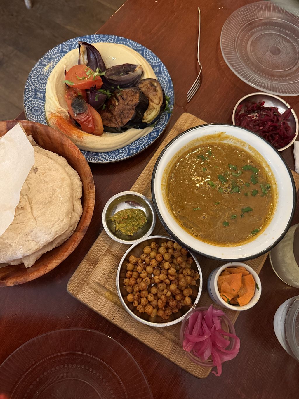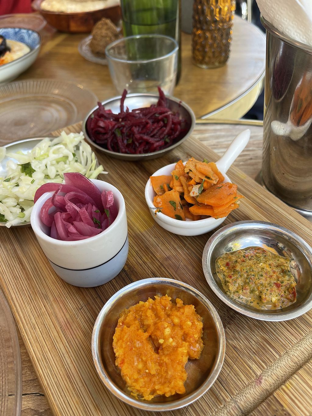 The food itself was amazing, with creamy hummus and baba ganoush and tasty falafel. Also loved all the mini pickled side dishes, so every bite you took could be a different combination of things.