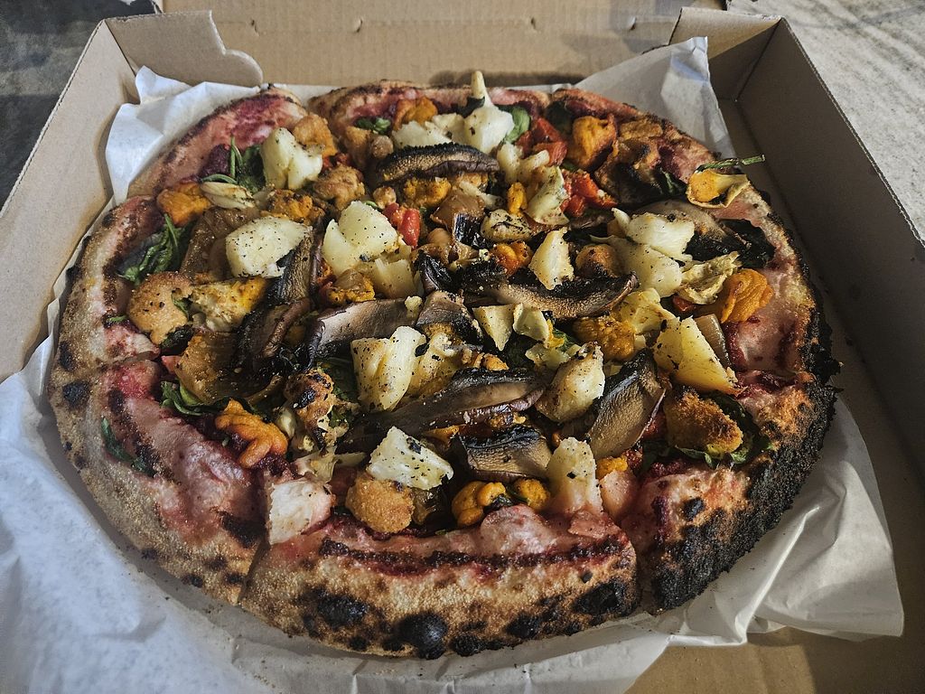Serves meat, vegan options available. Food truck offering made-to-order pizzas with vegan options such as vegan cheeses and vegan bacon. Vegan choices include Da Supreme Margarita with vegan cheese, Da Fig-Get-About-It with optional vegan bacon, or the option to build your own pizza with mostly house-made toppings. Open Mon 10:00am-8:00pm, Tue-Sun 10:30am-8:00pm.