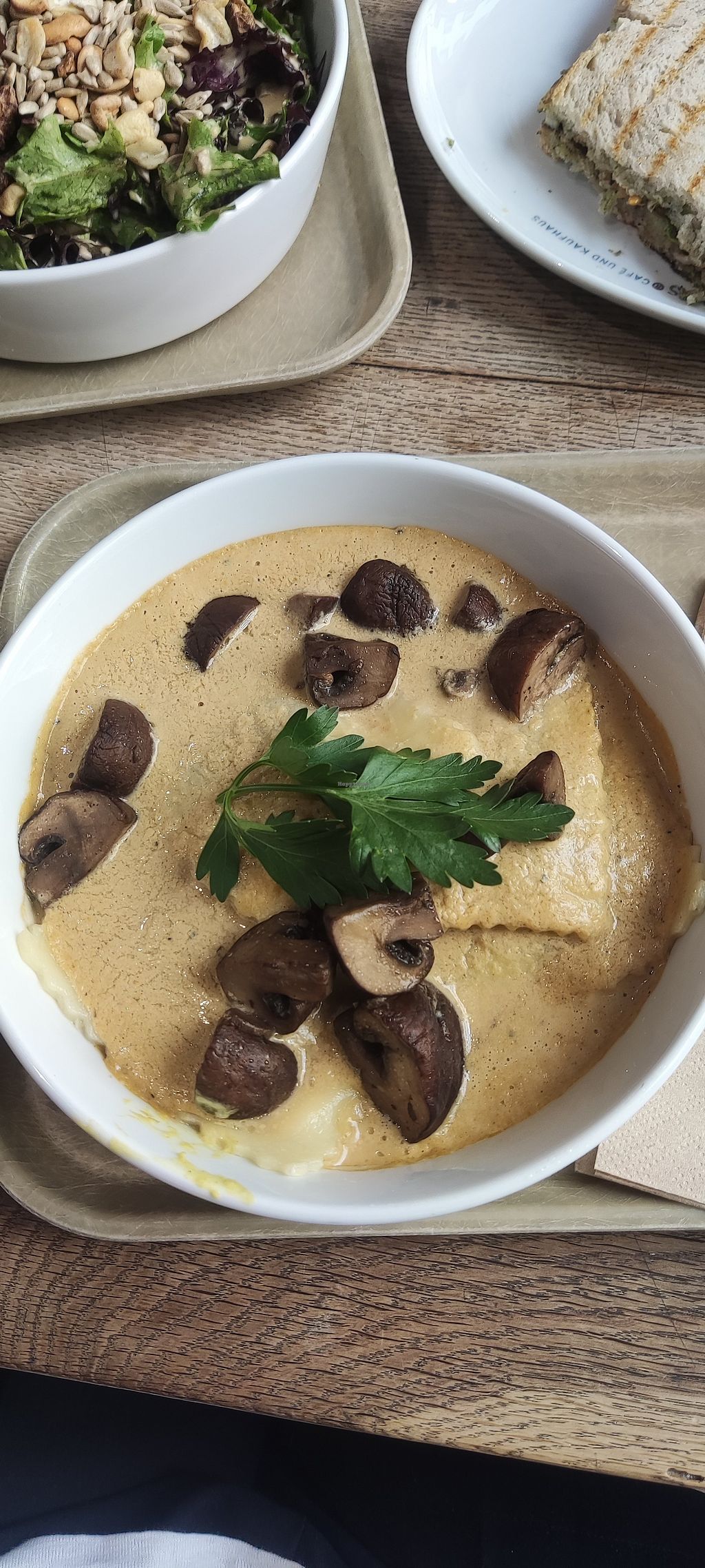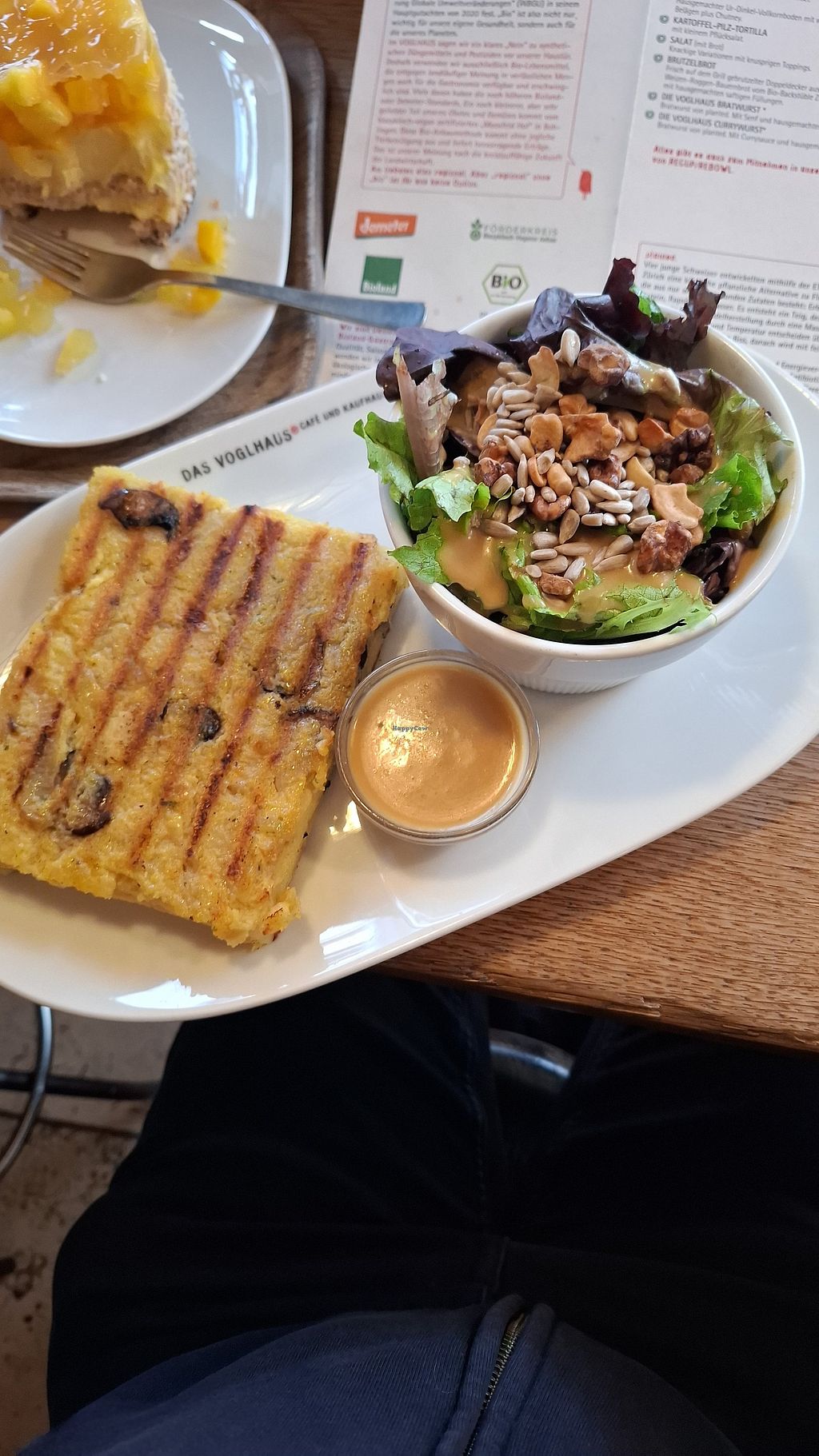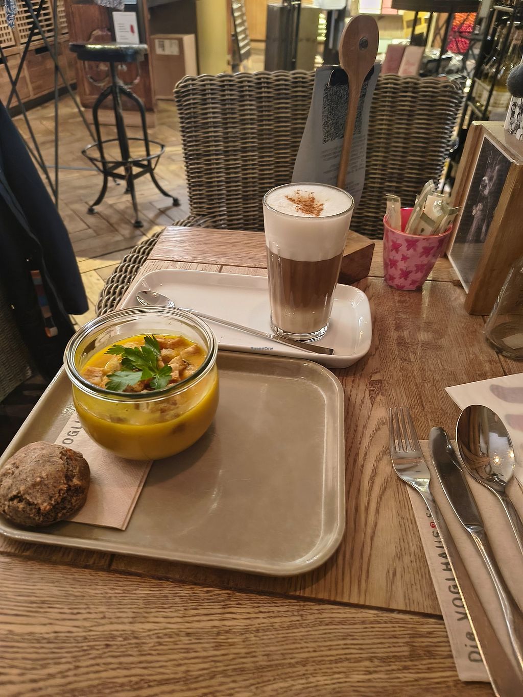 You order at the bar. We had the local herb tea, a quite tasty loose leaf tea. For lunch we had the spatzle and the tasty ravioli. Portions were not that big with only 4 big ravioli per plate. The spatzle was a bit bland without sauce, only had lentil stew and smoked tofu. Pooring it into the leftover ravioli sauce made it more tasty. As a dessert you have a huge selection of cakes. We had the cheese cake and cherry cake. We liked the cheese cake most, it was quite fresh.