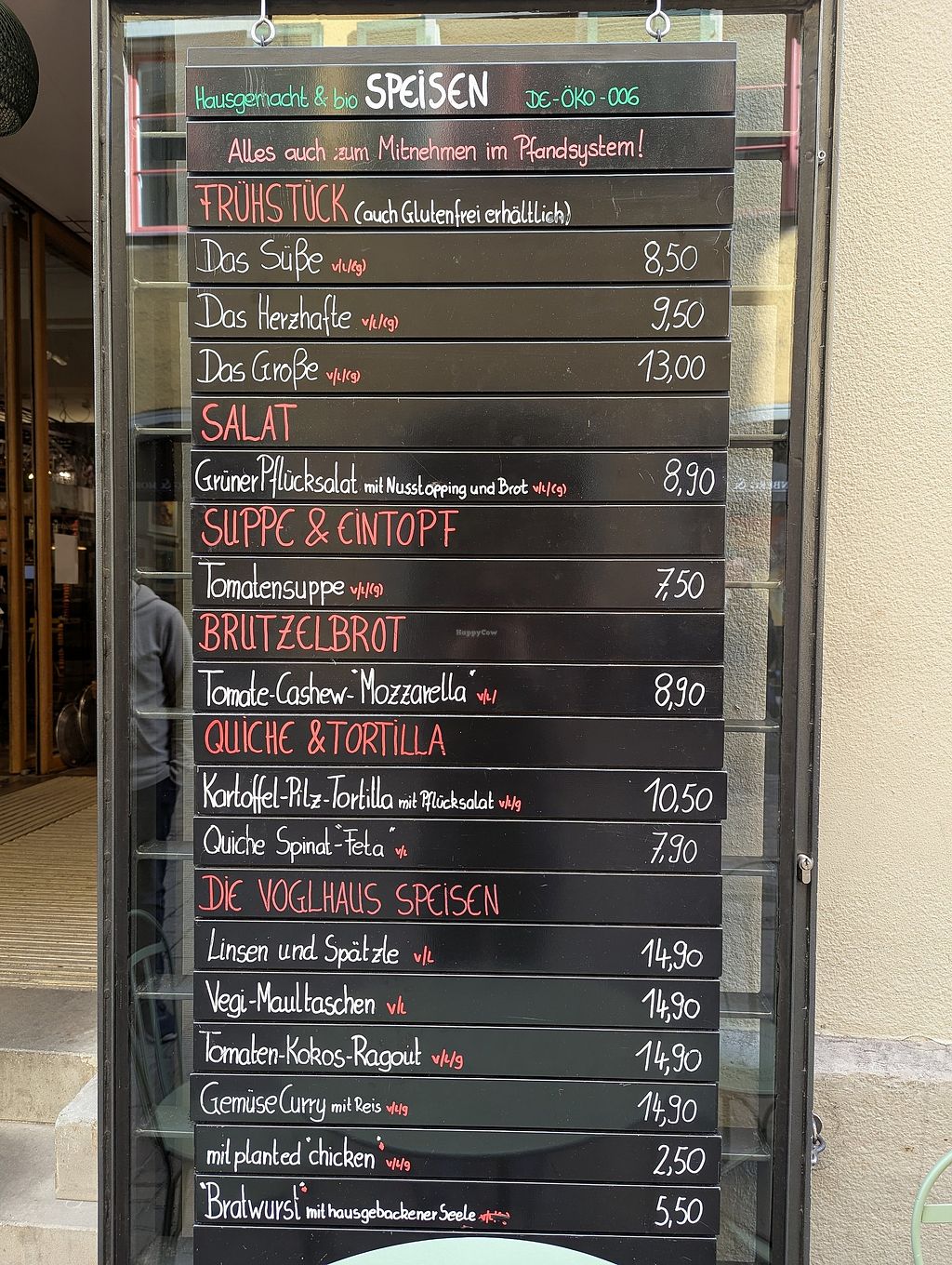 A corner street cafe and shop with a menu that includes vegan options such as salads, hot meals, coffee drinks, and a large selection of cakes (many of them using vegan cream substitutes). Open Mon-Sat 08:00-19:00, Sun 09:00-18:00.