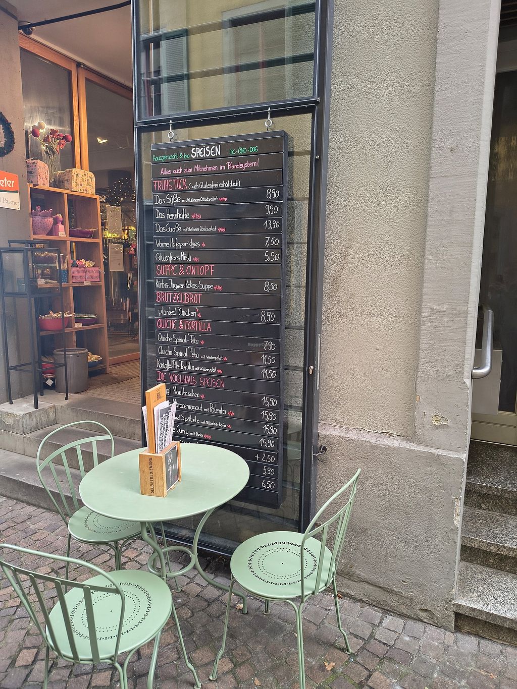 Kleiner Tipp. Wer etwas entspannter und ruhiger sitzen möchte, kann es auch auf der anderen Seite im Kaufladen versuchen. Hier stehen auch ein paar Sitzplätze zur Verfügung.