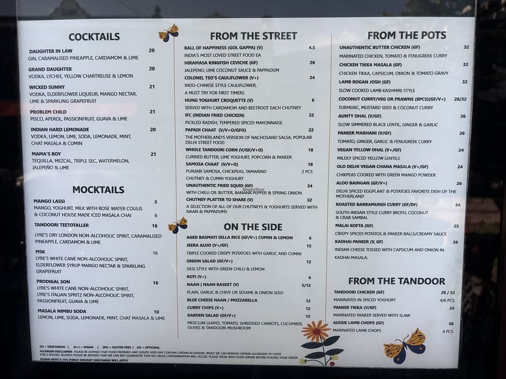 Serves meat, vegan options available. Restaurant offering veganizable dishes like "Old Delhi vegan chana masala" (chickpea curry with mango powder), vegan yellow dhal (spiced lentil curry), roti (whole wheat flatbread), and garden salad (mixed greens with vegetables). Open Mon-Thu 5:00pm-9:00pm, Fri-Sat 5:00pm-10:00pm, Sun 5:00pm-9:00pm.