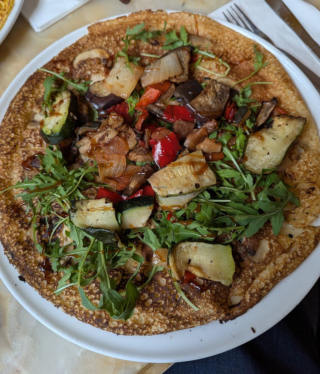 They do offer to make the pancakes vegan. I had one with mushrooms only, the was a bit dull. So next time I chose grilled vegetables and it was very good, savory, fulfilling, onions baked in the pancake dough. Would recommend!