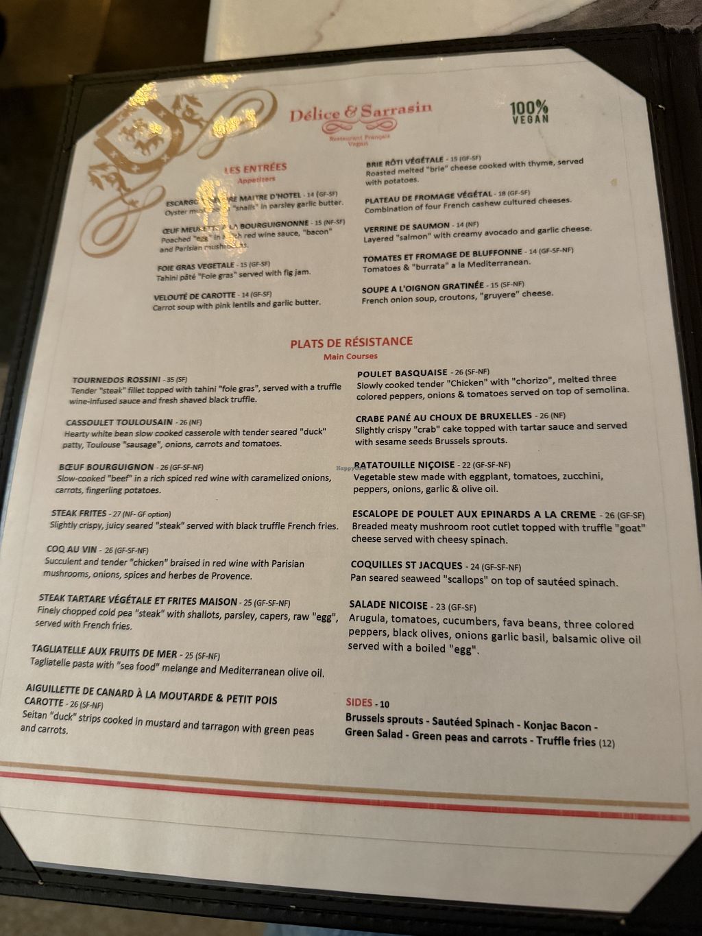 I went here recently for a birthday. The food is traditional French, which imo totally breaks out of the stereotype that French food cannot be vegan. The cheeses and “escargot” mushrooms with bread were to die for, and our favorite mains were the coq au vain and boeuf bourguignon. It’s a very special place, and I hope to see some inspiration brought over to the west coast soon, since we don’t have anything like this here in the Bay Area. Family owned, and very cozy. It’s worth the special occasion! Not to mention the buttery, flaky croissants at the bakery in the front.