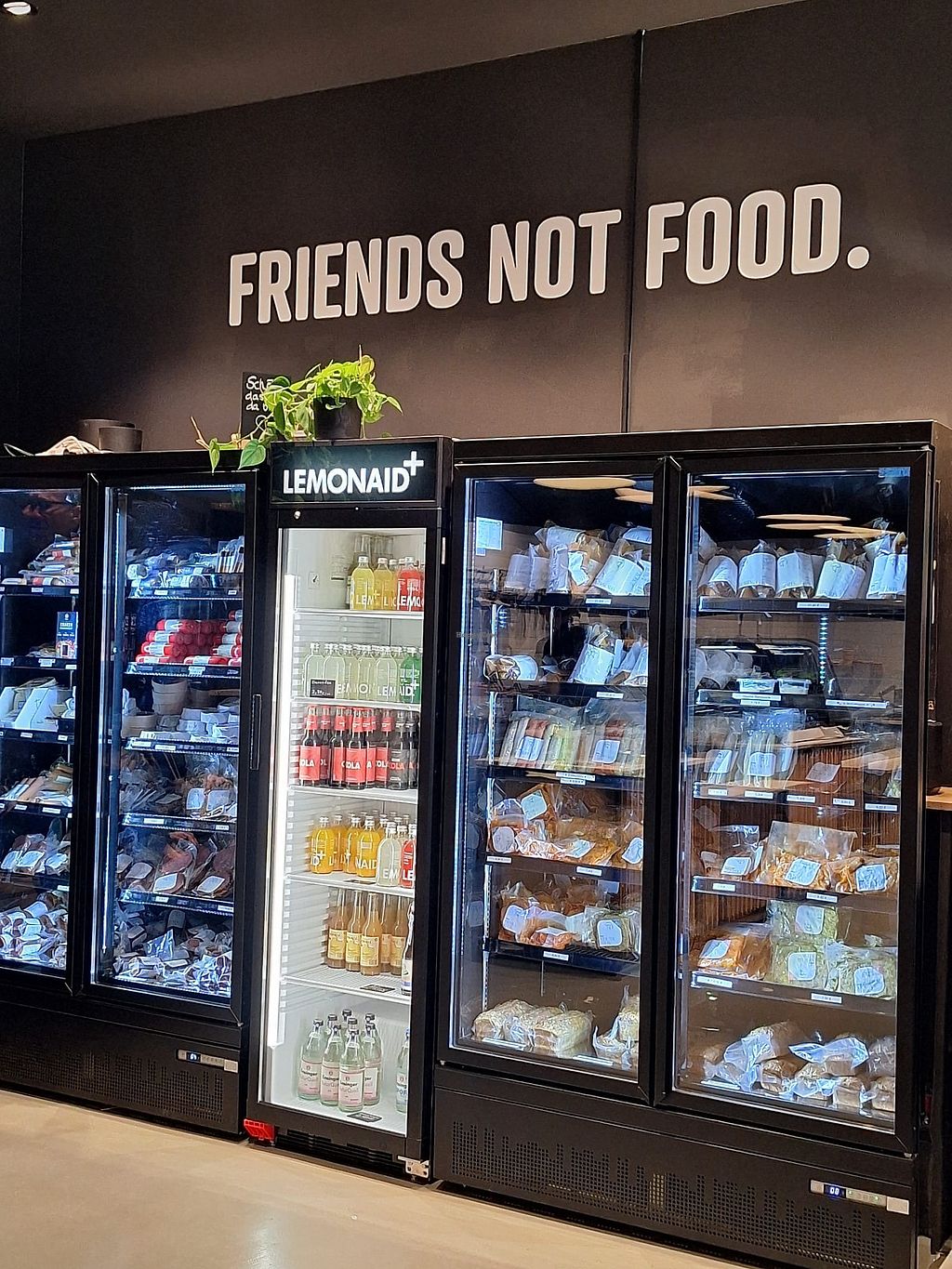 Es gibt eine Frischetheke mit Aufschnitten und verschiedenen veganen Käsesorten (u.a. Blauschimmelkäse). Außerdem Kühlschranke mit vielen eingeschweißten Produkten (Fisch-, Fleisch-, Wurst- und Käseimitate). Man kann Currywurst, Salamibrote und Fleischkäsebrötchen direkt warm erhalten und vor Ort essen.