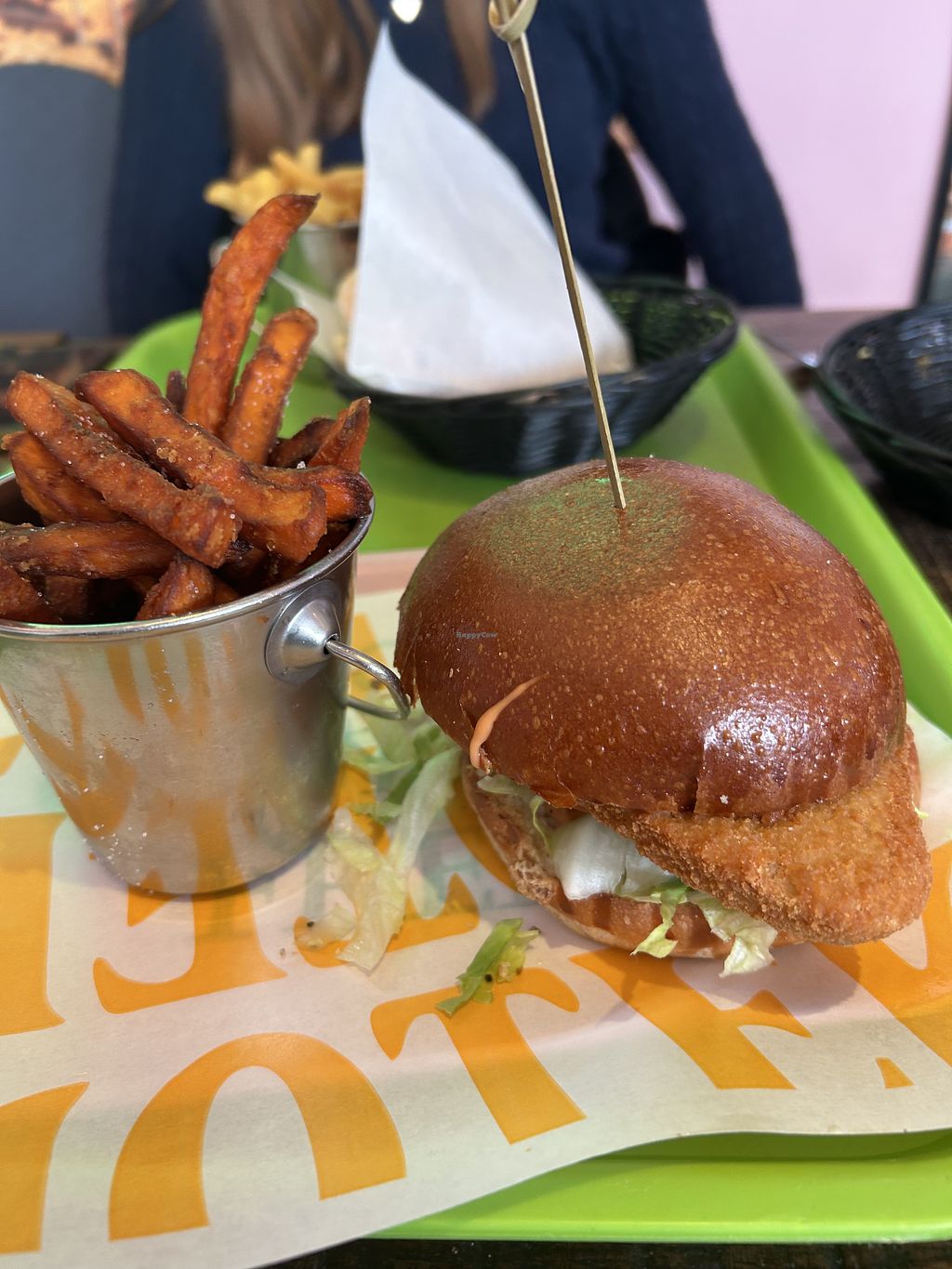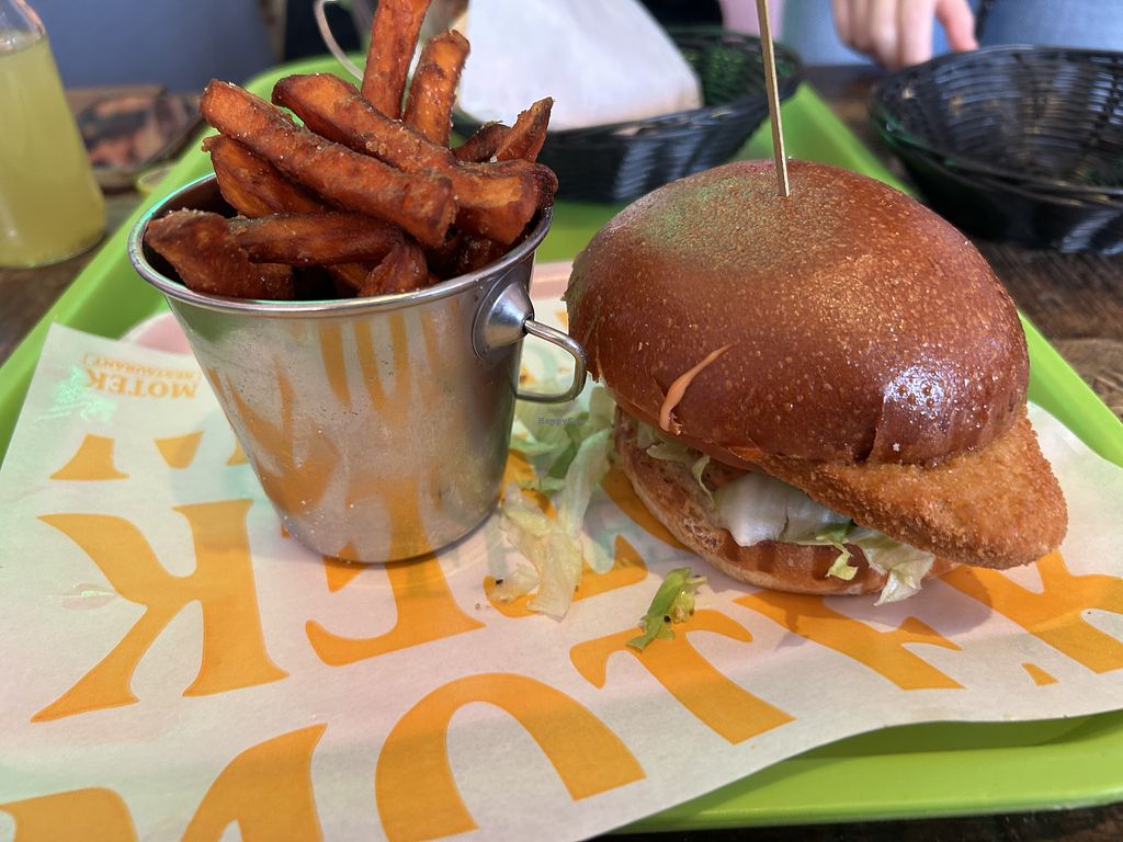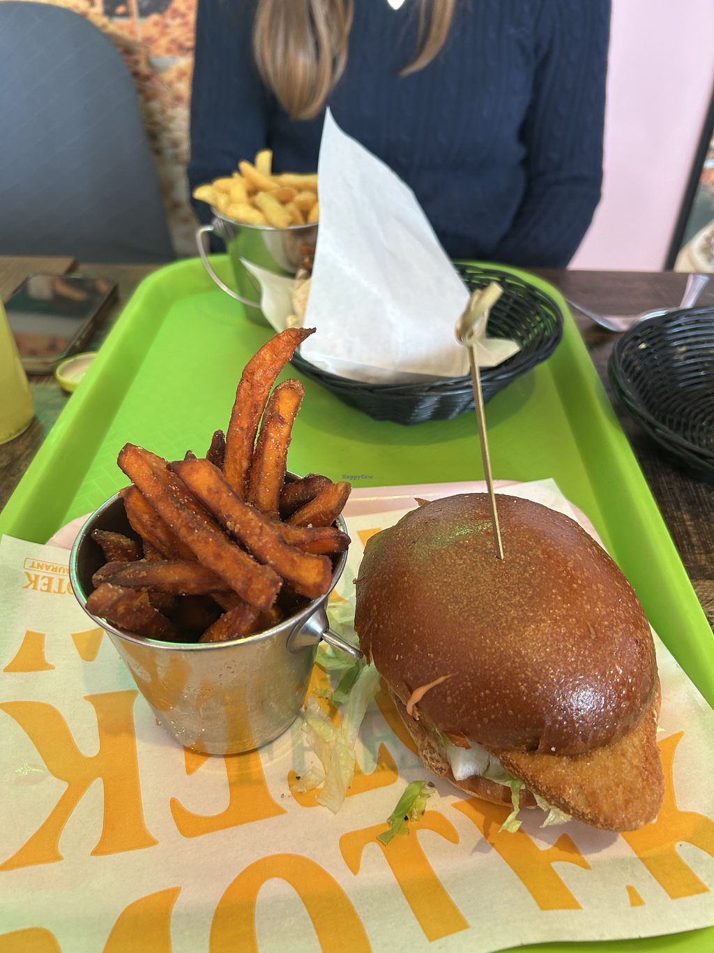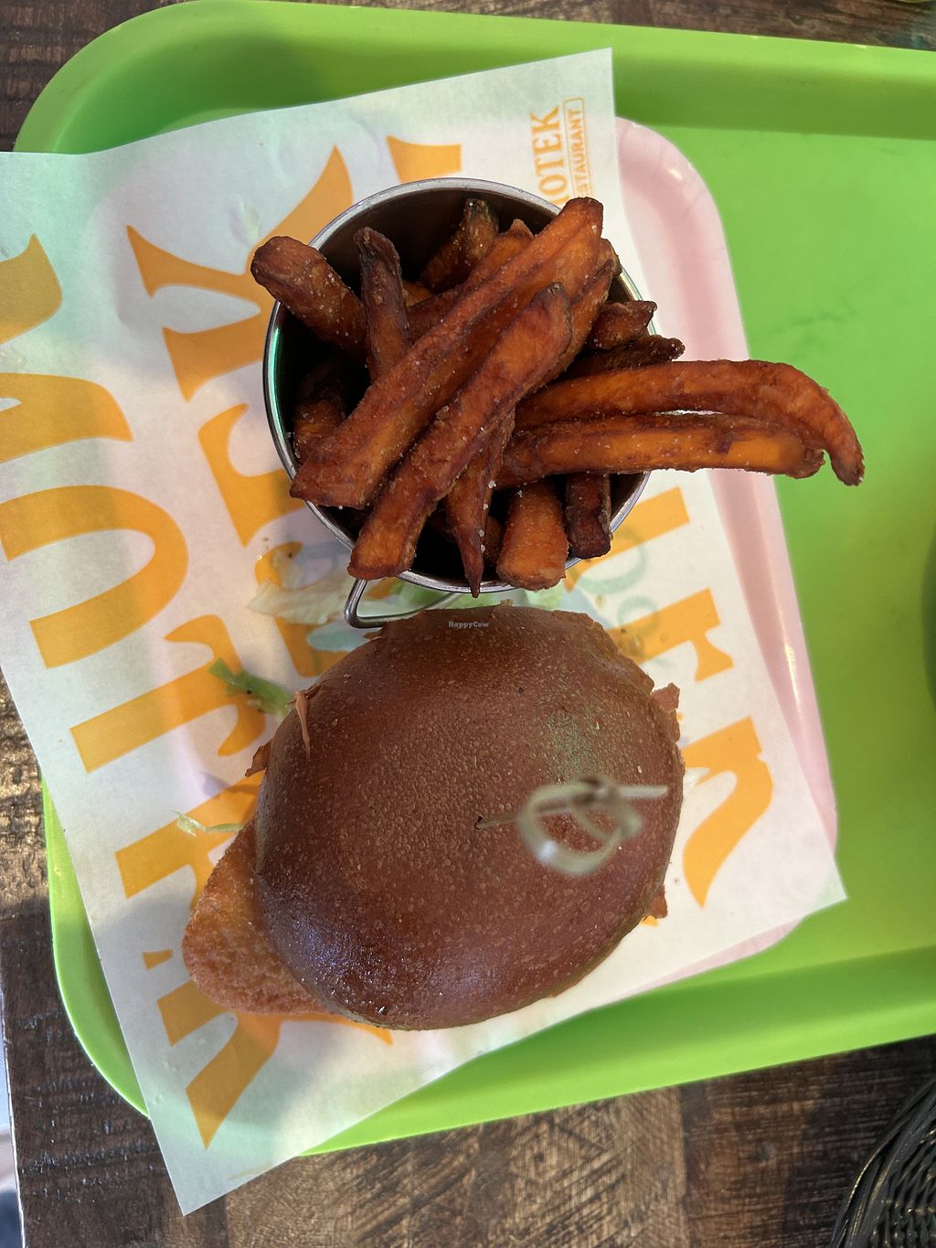 I came here for lunch and ordered Keanu’s Crispy Chick’n Burger with fries, aioli, and a peach iced tea. Everything was delicious. The meal was filling.