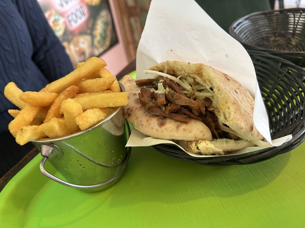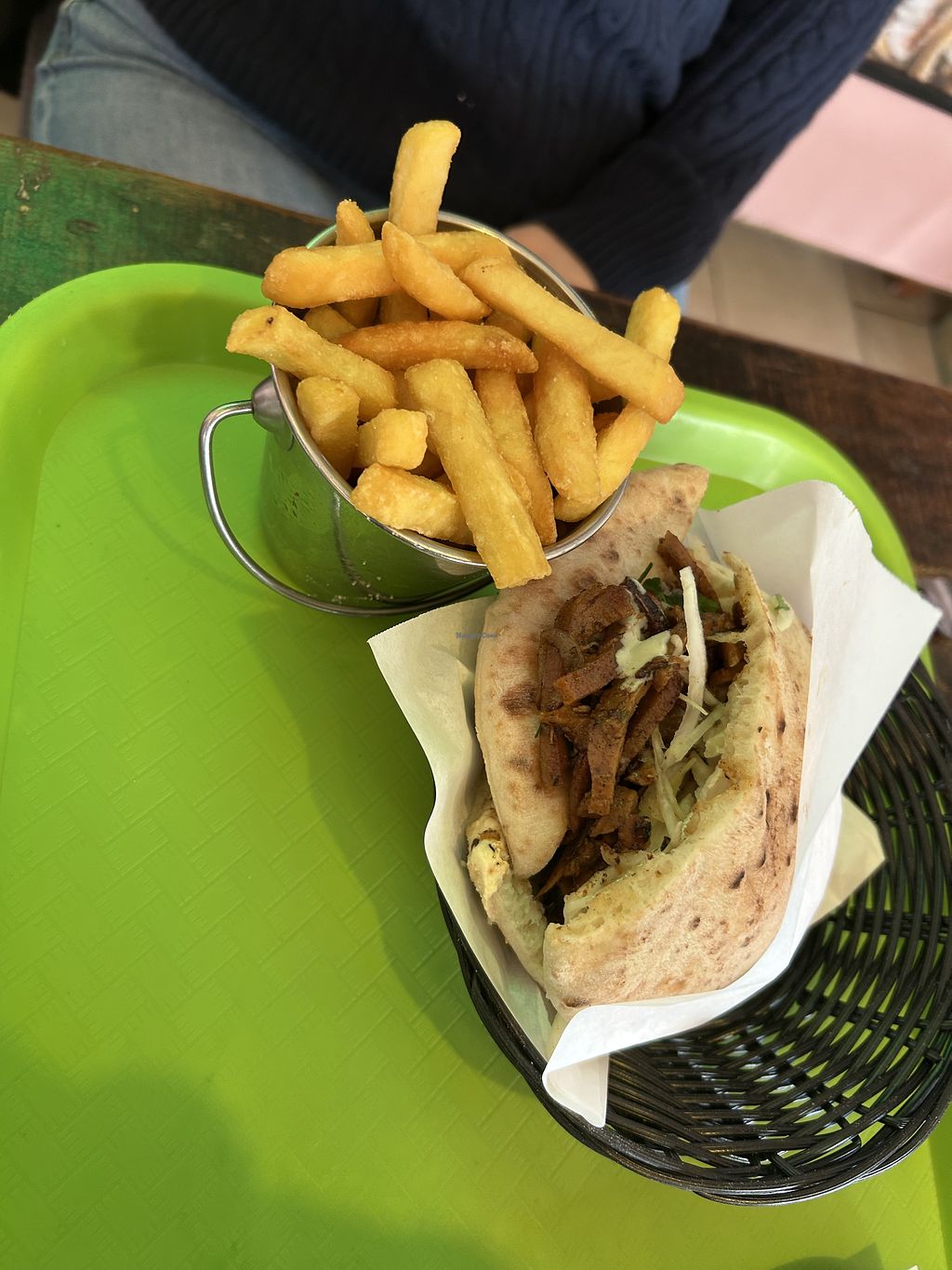 The food was good but I would recommend the plate version because the pita was not too full and Pommes were tiny bit dry wish I had more hummus too