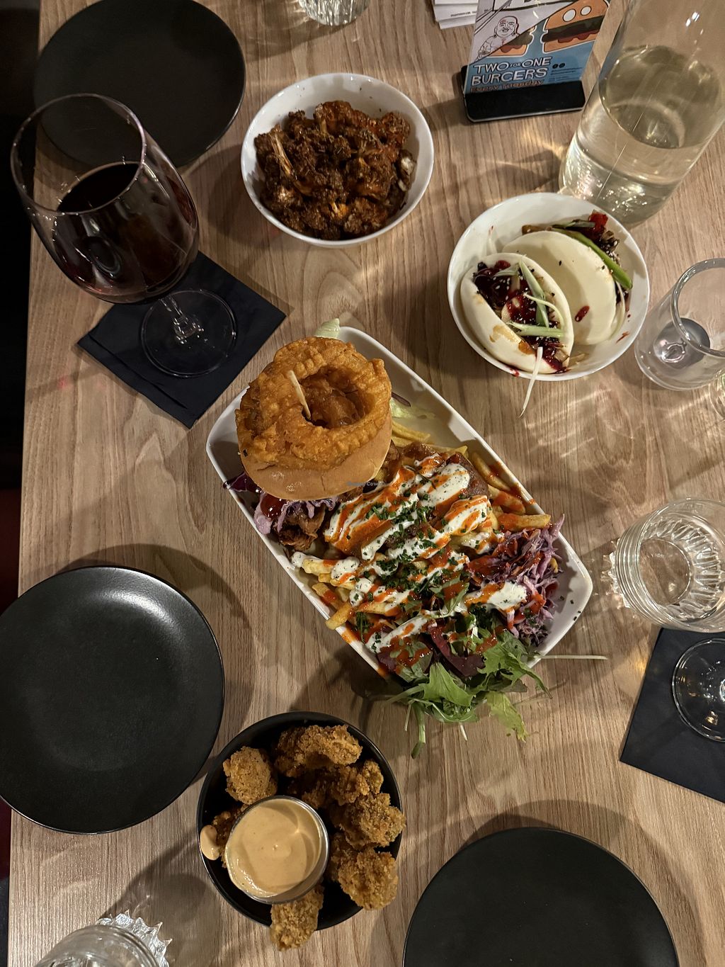 Crispy seitan burger with jackfruit and salt n pepper fries.
