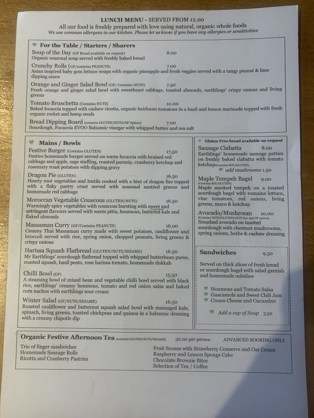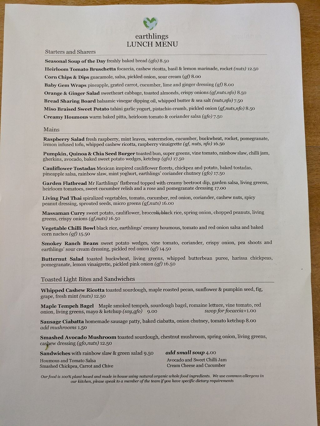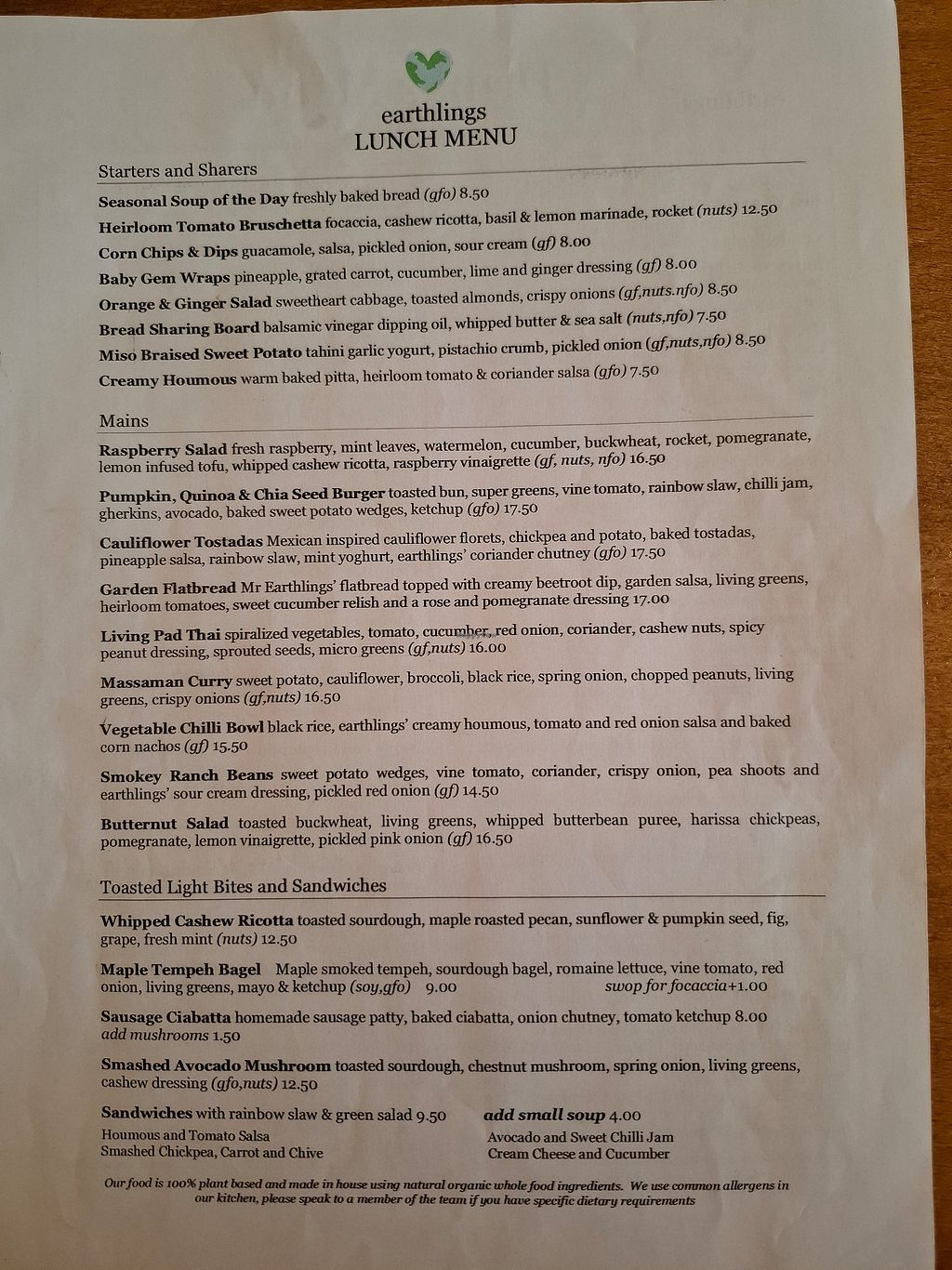 Visited Earthlings for lunch with friends and their dog whilst out on a walk. Its an oasis of calm and tranquillity and you feel relaxed as soon as you enter. We had a table in the window at the front and on good days you can sit outside. This is amazing vegan food of a high quality, freshness and flavours... we absolutely loved it. We had chips & dips, vegan nachos, nourish bowl, massaman curry, masala curry, woodland chestnut bake, followed by mini brownie bite and chocolate pot with teas and coffees. The food was fantastic, beautifully presented, with fresh ingredients cooked perfectly. We will definitely return again especially as we can get there by train. I did originally think it was 100% vegan but noticed dairy milk on the menu for drinks, so not sure why they offer this when they have a good selection of plant milks some which they charge 50p for. Its also good for people who are gluten free with a large proportion of the menu suitable. Highly recommended.