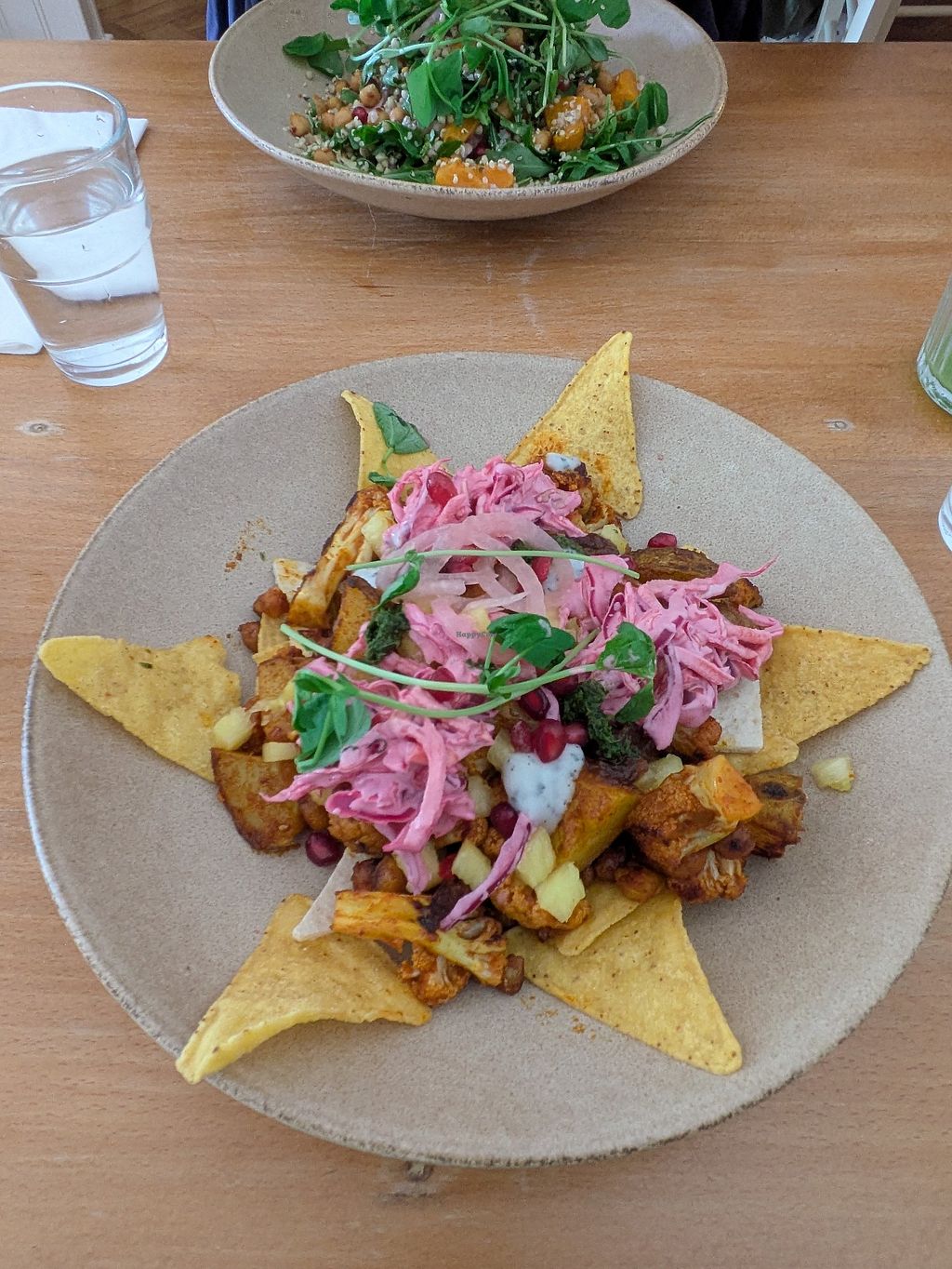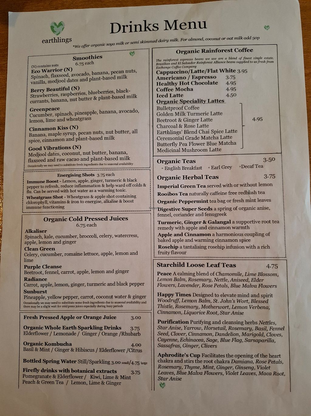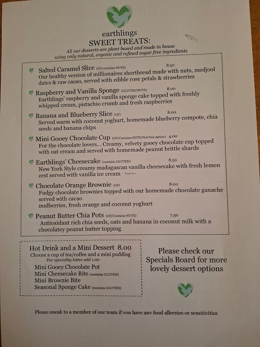 Visited Earthlings for lunch with friends and their dog whilst out on a walk. Its an oasis of calm and tranquillity and you feel relaxed as soon as you enter. We had a table in the window at the front and on good days you can sit outside. This is amazing vegan food of a high quality, freshness and flavours... we absolutely loved it. We had chips & dips, vegan nachos, nourish bowl, massaman curry, masala curry, woodland chestnut bake, followed by mini brownie bite and chocolate pot with teas and coffees. The food was fantastic, beautifully presented, with fresh ingredients cooked perfectly. We will definitely return again especially as we can get there by train. I did originally think it was 100% vegan but noticed dairy milk on the menu for drinks, so not sure why they offer this when they have a good selection of plant milks some which they charge 50p for. Its also good for people who are gluten free with a large proportion of the menu suitable. Highly recommended.