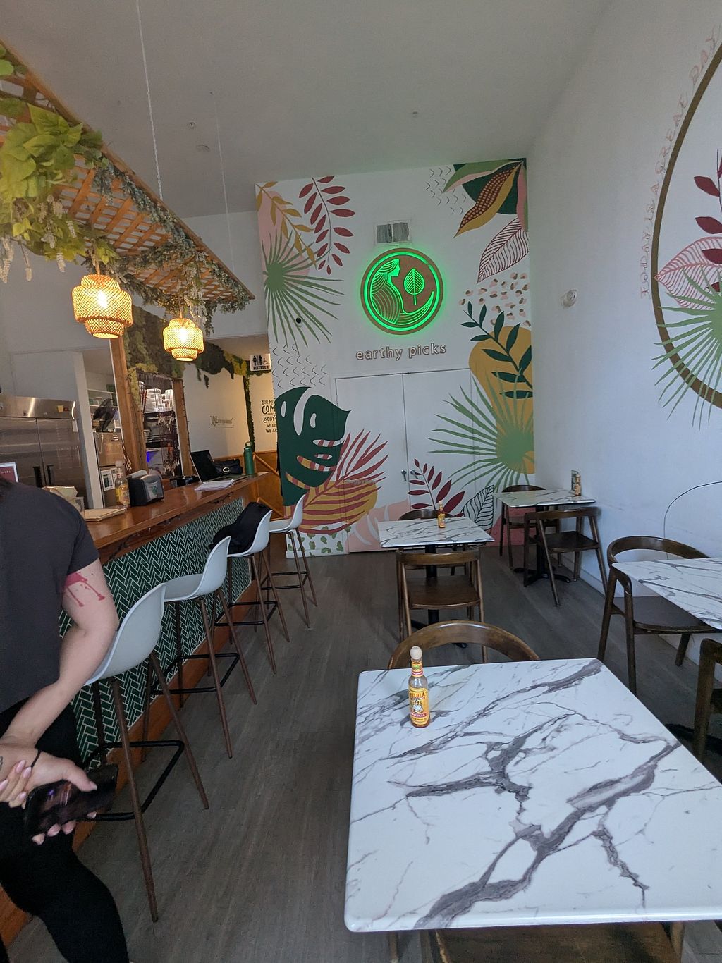 100% Latin Vegan Cafe with a bar and sit down seating. The Crazy About You bowl and the Earthy Salad are excellent, filling and delicious. The staff is very friendly and the atmosphere is very upbeat.